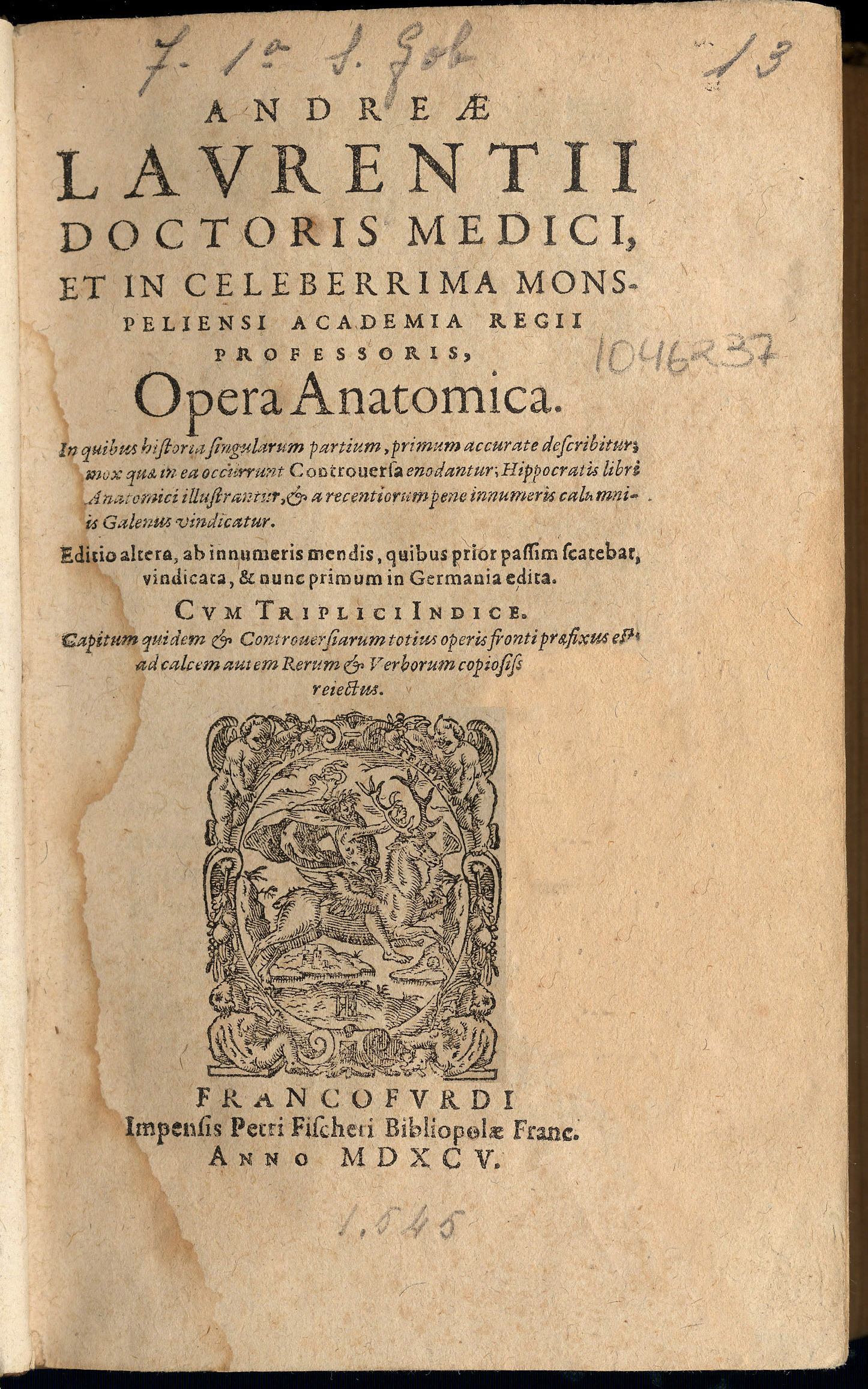 DU LAURENS, André. (Laurentius Dulaureus) – Opera anatómica. – Francofvrti : Impesis Petri Fischeri Bibliopolae Franc., 1595. — [24], 109 p. ; 8º (20 cm). — Perg.