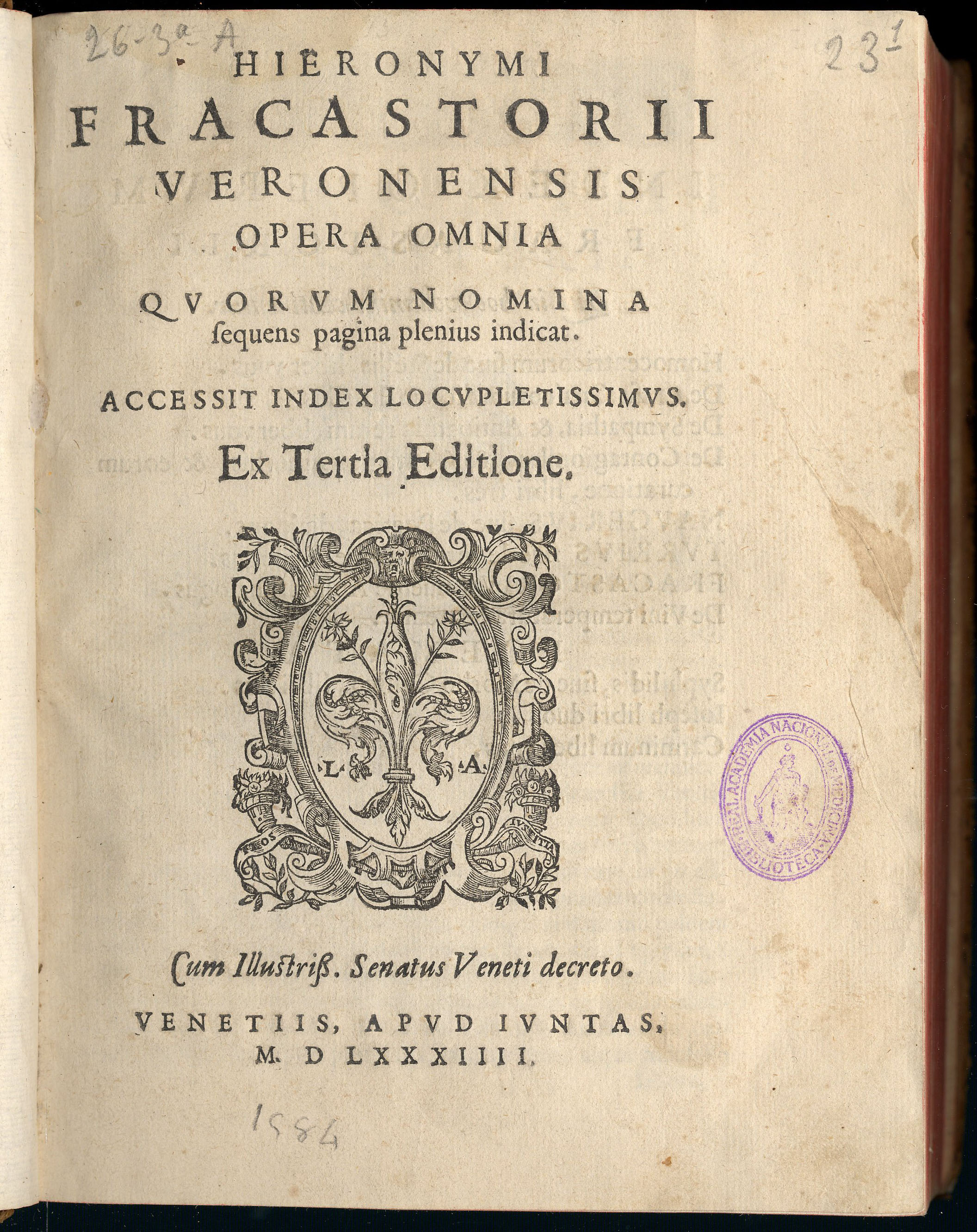 FRACASTORO, Girolamo (1483-1553). — Opera omnia… — Venetiis : Apud Iuntas, 1584. — [21], 213 h. ; 4º [23 cm.]. – Pasta