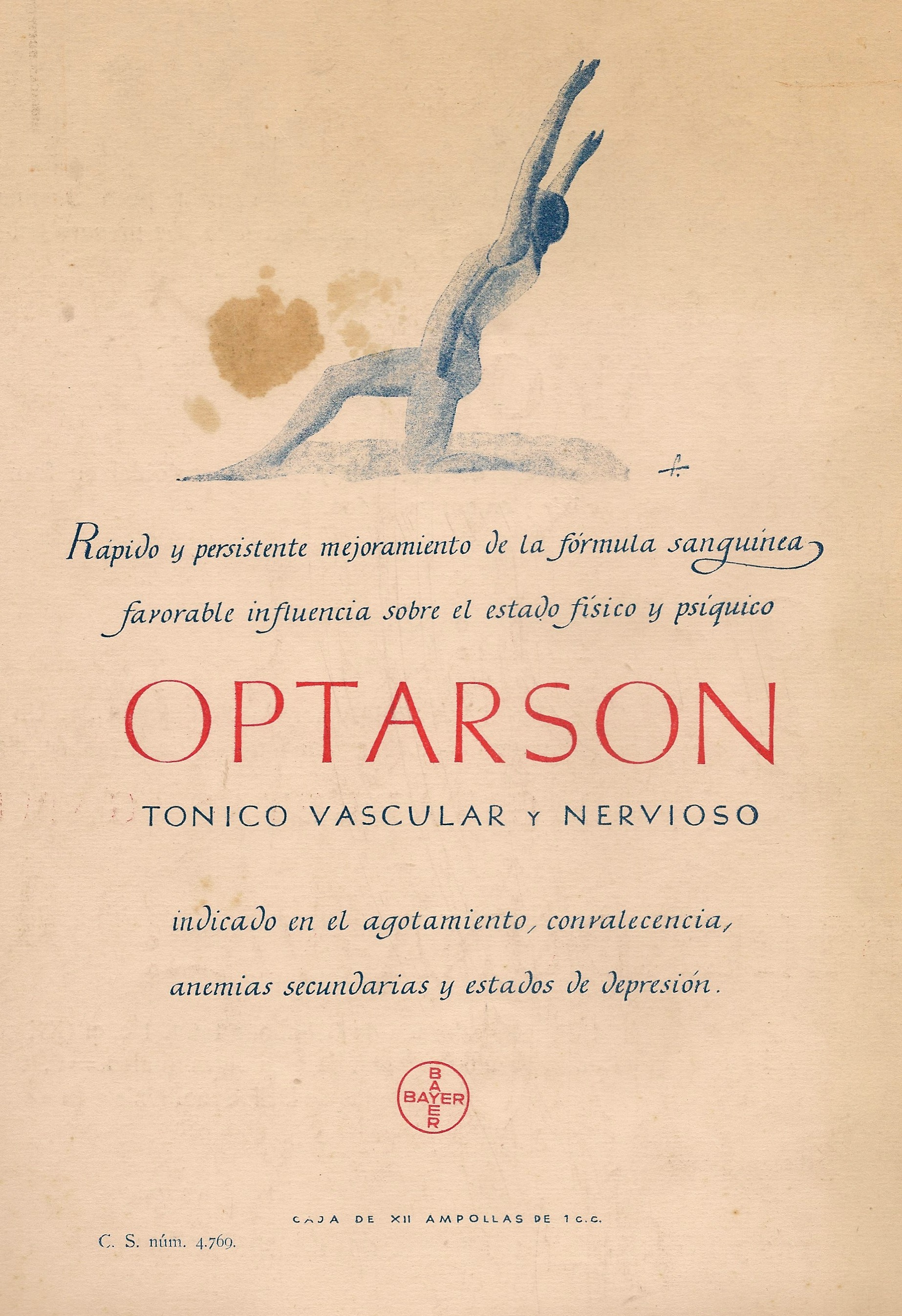 Optarson. Ampollas. Tónico vascular y nervioso. Indicado en agotamiento, convalecencia, anemias secundarias, depresión. Bayer. Publicidad aparecida en la contraportada de la revista Gaceta Médica Española. Año 18, número 1, 1944.