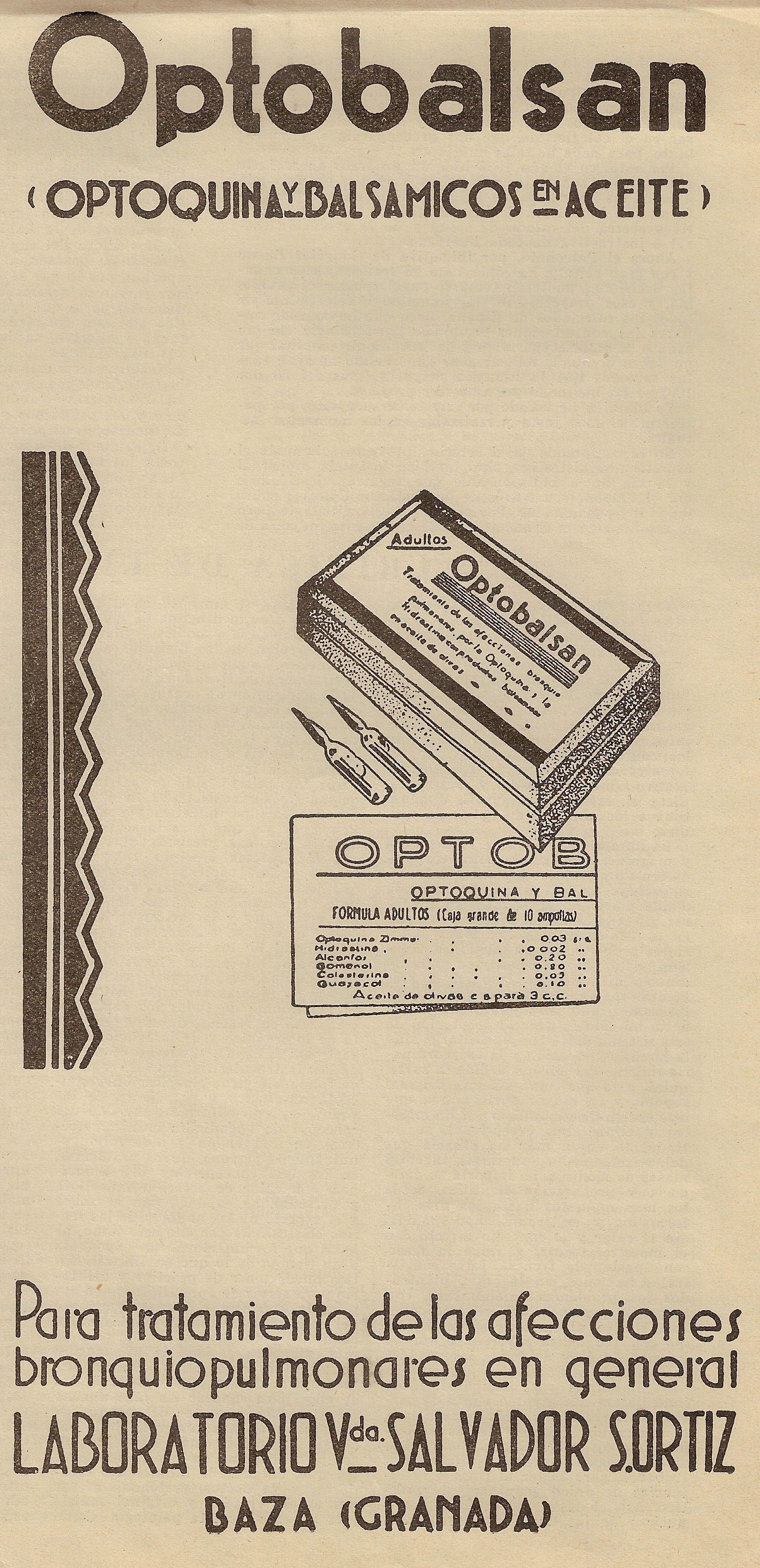 Optobalsan Optoquina y balsámicos en aceite. Tratamiento de las afecciones bronquipulmonares. Laboratorio Viuda de Salvador S. Ortiz. Baza (Granada). Boletín del Consejo General de Colegios de Médicos de España, Enero 1947.