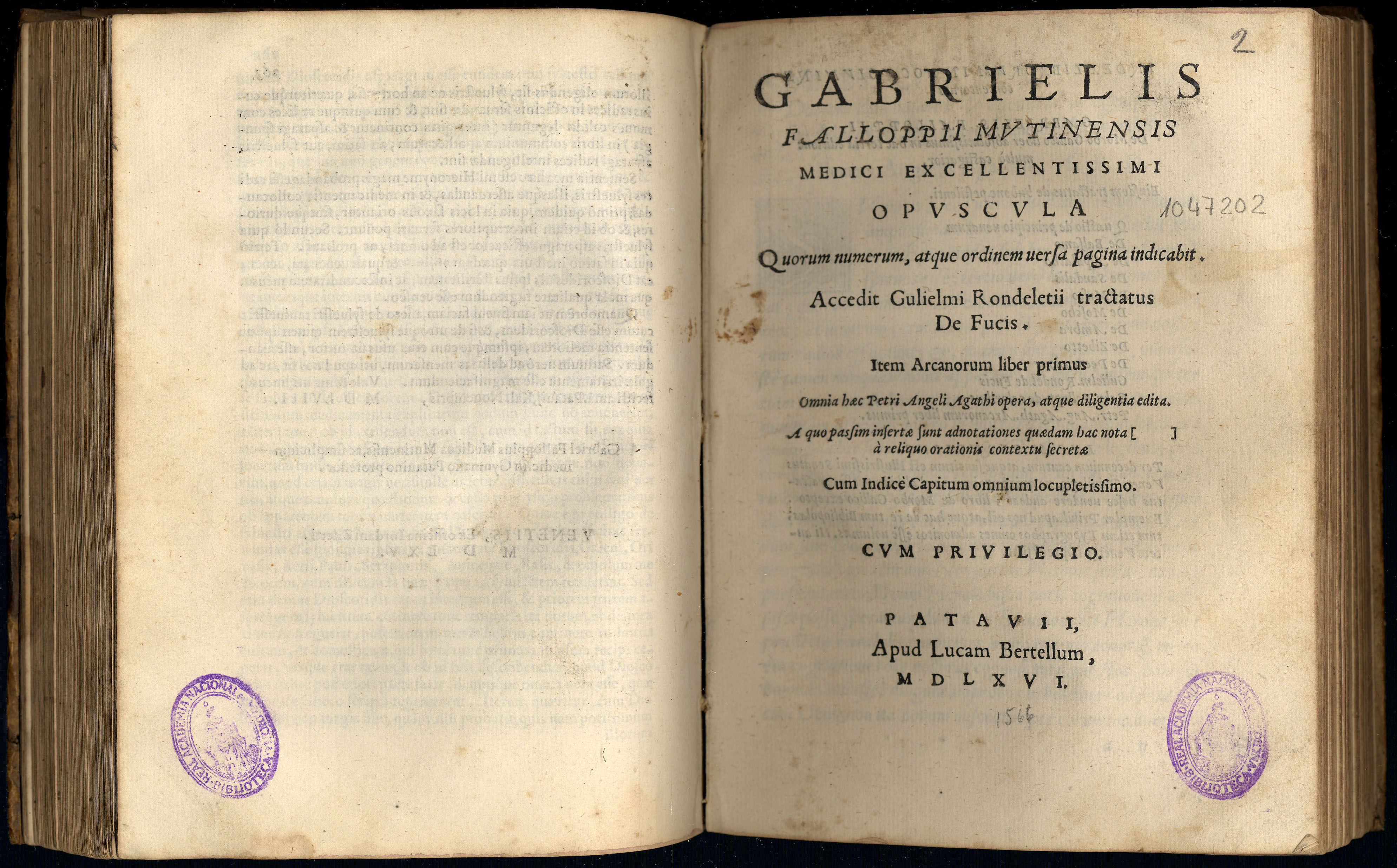 FALLOPIO, Gabrielle. — Opuscula …. — Patavii : Apud Lucam Bertellum, 1566. — [3], 61, 72 h. ; 4º (21 cm). –Perg.
