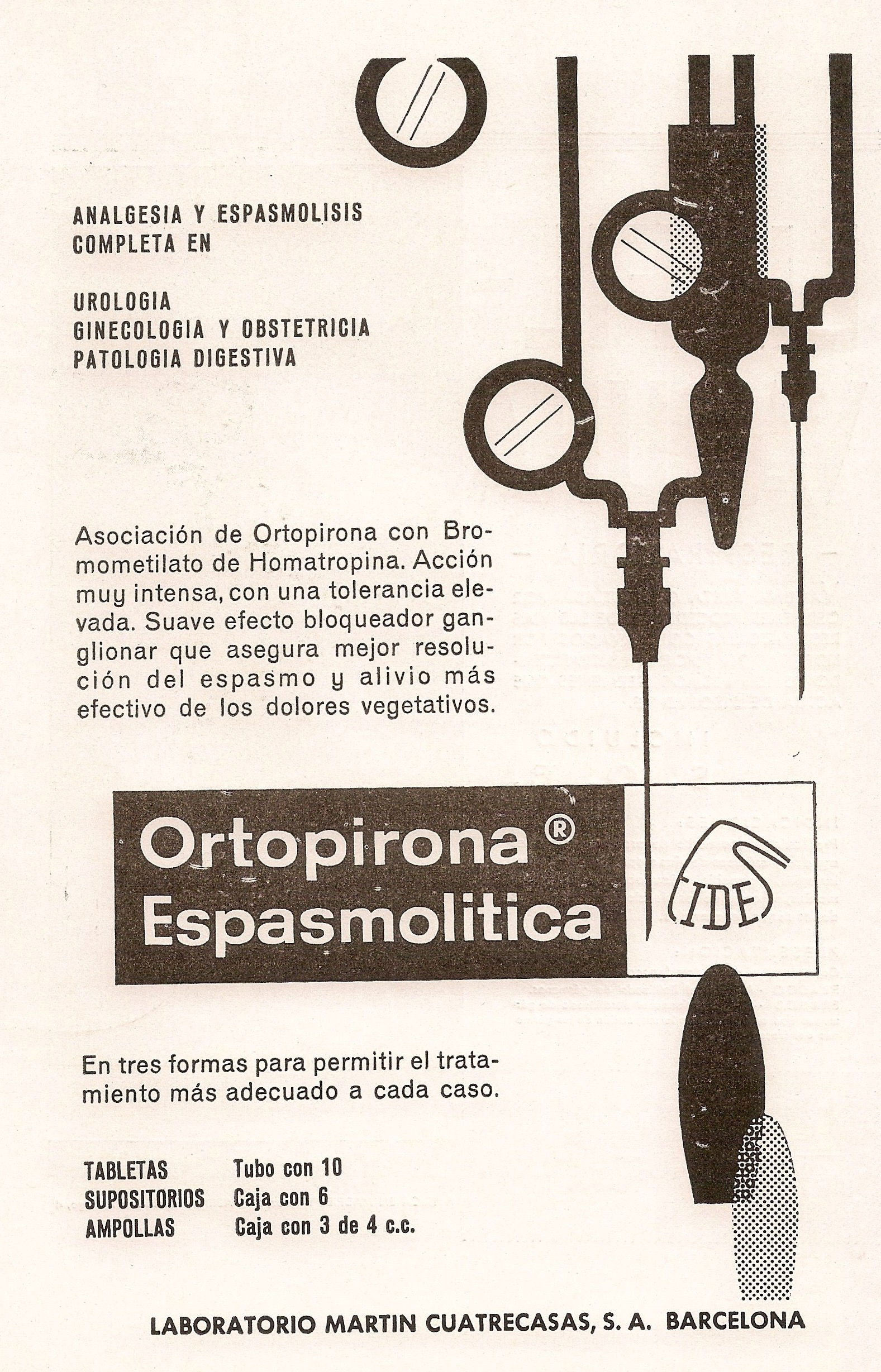 Ortopirona. Tabletas, supositorios, ampollas. Ortopirona con Bromuro de Homatropina. Analgesia completa en urología, ginecología y obstetricia y patología digestiva. Martin Cuatrecasas. Archivos de la Facultad de Medicina de Madrid, enero, 1963.