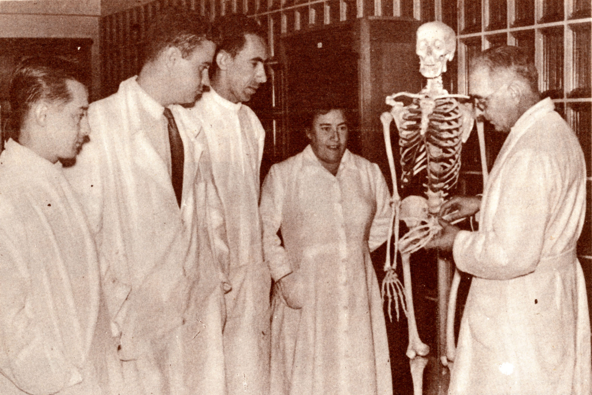 El Profesor Orts Llorca, catedrático de Anatomía, rodeado de varios alumnos, explica la articulación de la muñeca. Consejo General Colegios Médicos España, nov. 1955, p. 50