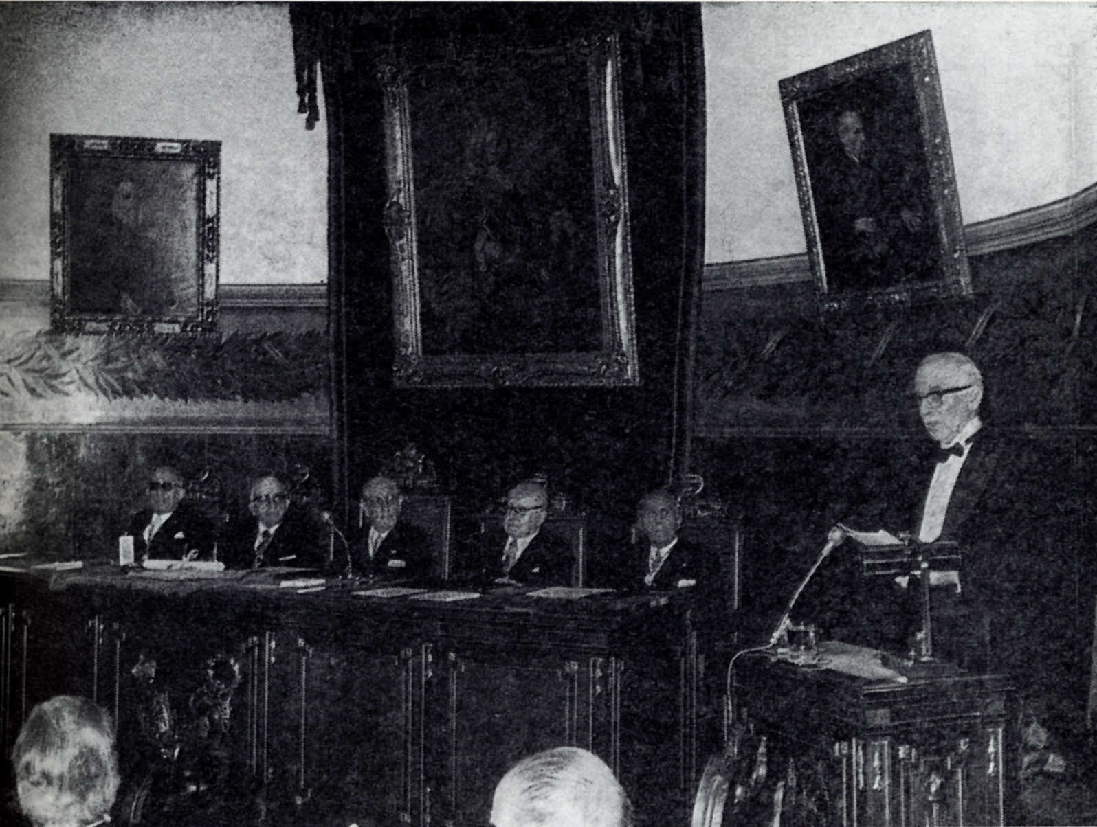 Mesa presidencial del acto de recepción como Acadeémico de Número de la Real Academia Nacional de Medicina del Prof. Francisco Orts Llorca. Bajo la presidencia del Prof. Bermejillo, Presidente de la Academia, le acompañan, a su derecha, D. Manuel Lora Tamayo, Presidente del Instituto de España, y el Prof. Lorenzo-Velázquez; a su izquierda, D. Dámaso Alonso, Director de la Academia Española, y el Prof. Valentín Matilla, Secretario Perpetuo de la Corporación.