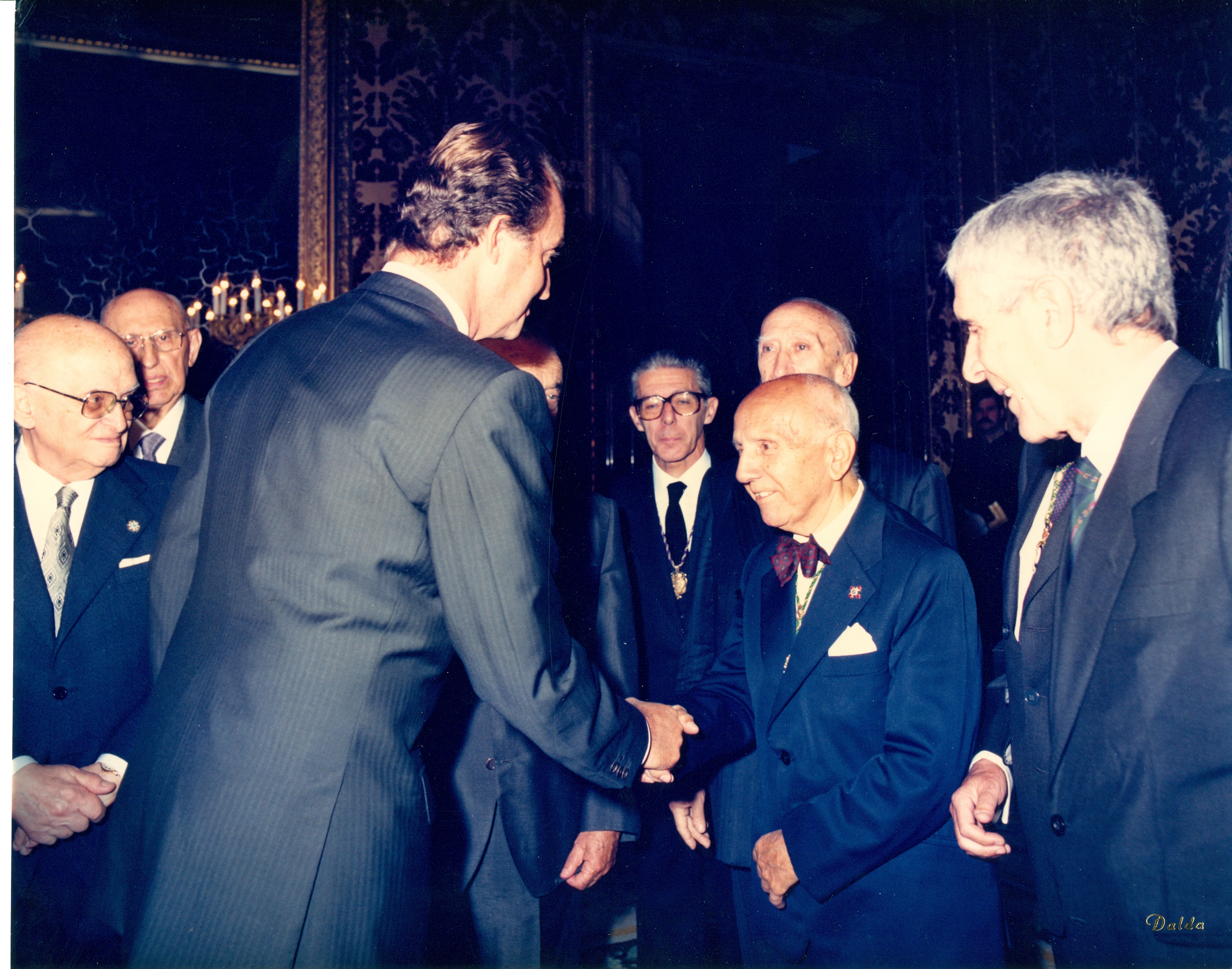 P. Zarzuela. S. M. Juan Carlos I, saludando al Secretario Perpetuo de la RANM D. Valentin Matilla, al fondo Pof. Luis Sánchez Granjel