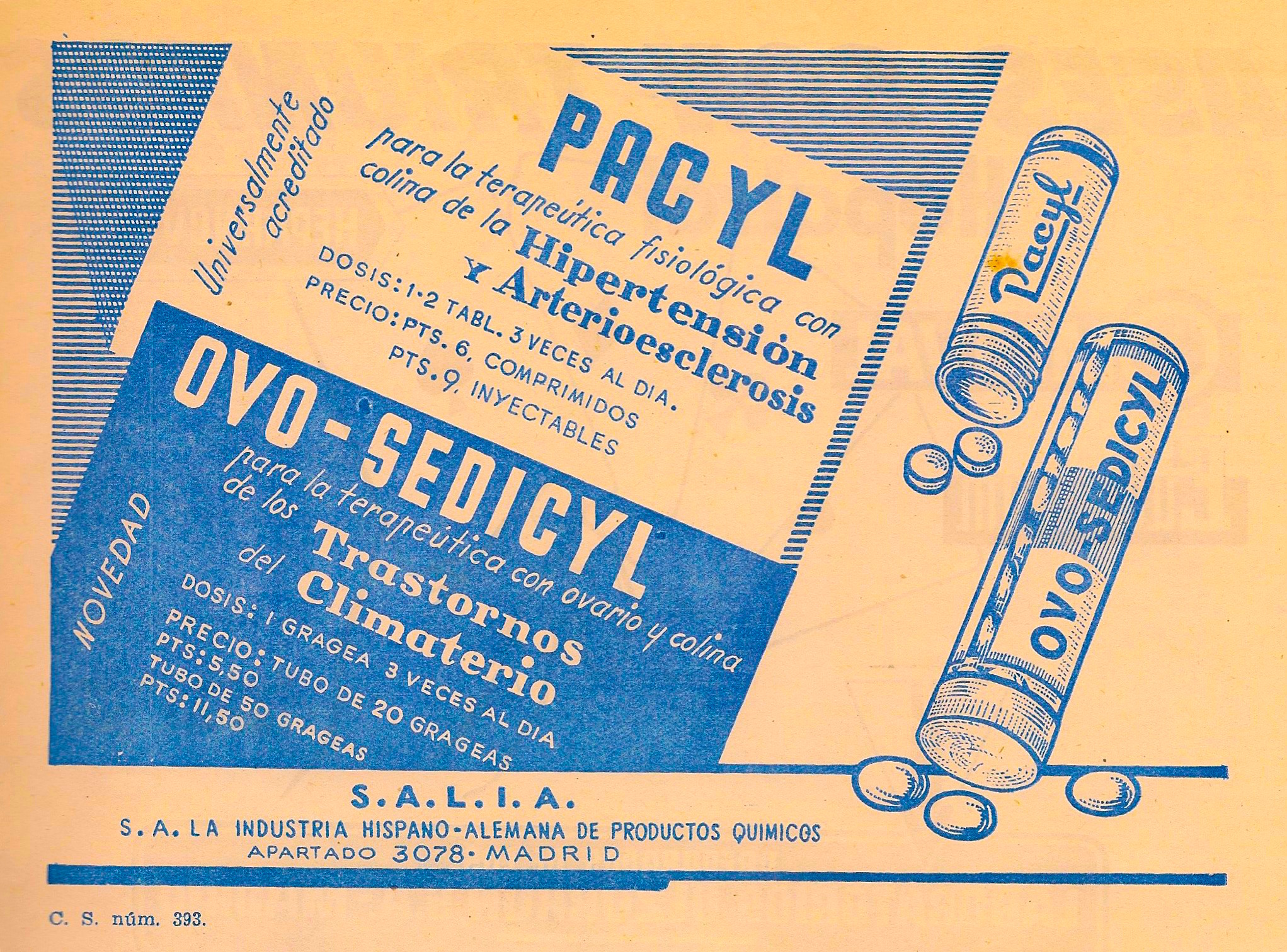 Pacyl: Tabletas. Hipertensión. Arterioesclerosis. Ovo-Sedicyl: Grageas.Trastornos del climaterio. A-A- La Industria Hispano-Alemana de Productos Químicos. Madrid. Publicidad aparecida en la revista Gaceta Médica Española. Año 18, número 2, 1944.