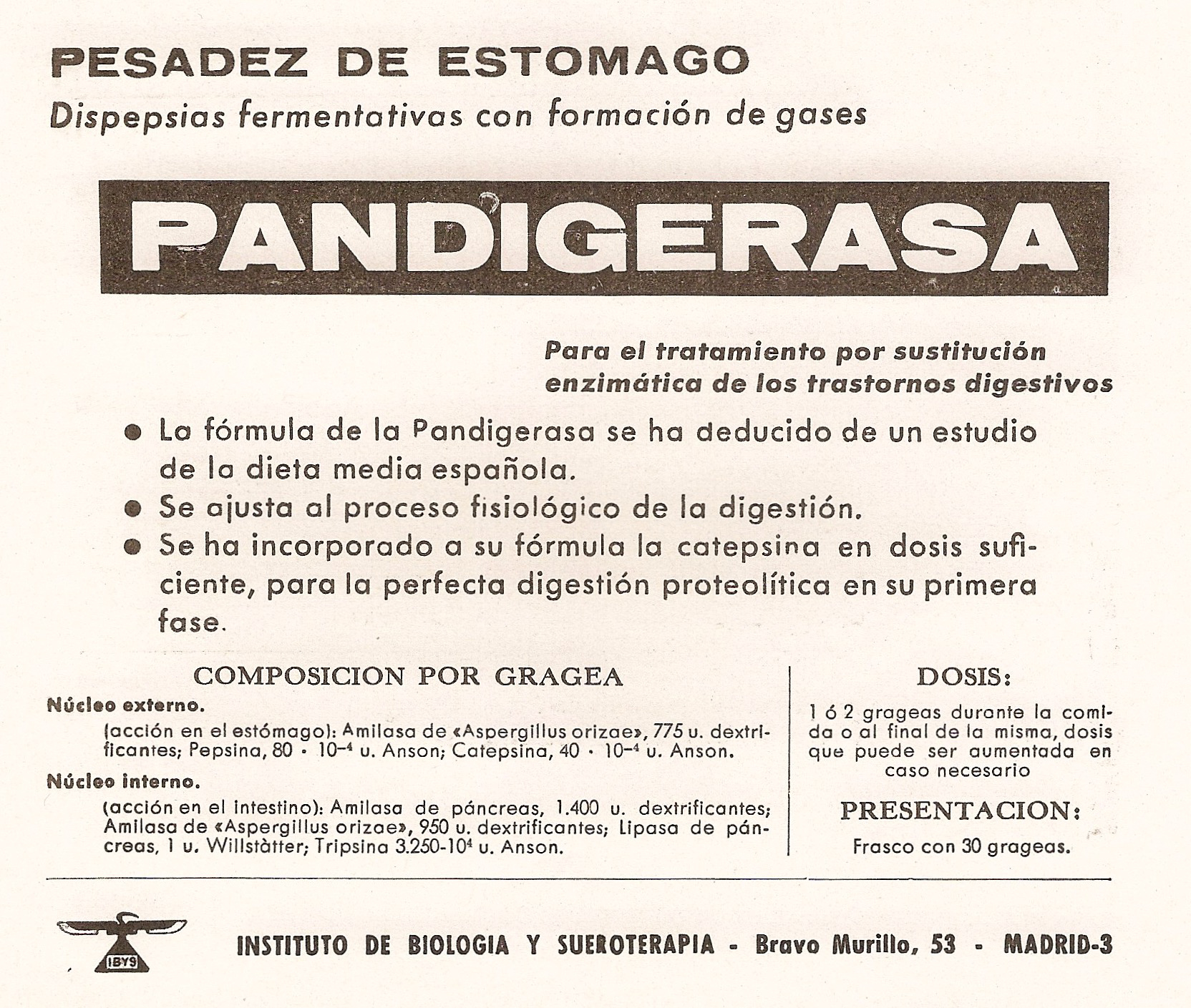 Pandigerasa. Grageas. Pesadez de estómago. Dispepsias fermentativas con formación de gases. Instituto de Biología y Sueroterapia., Madrid. Archivos de la Facultad de Medicina de Madrid, enero, 1963.