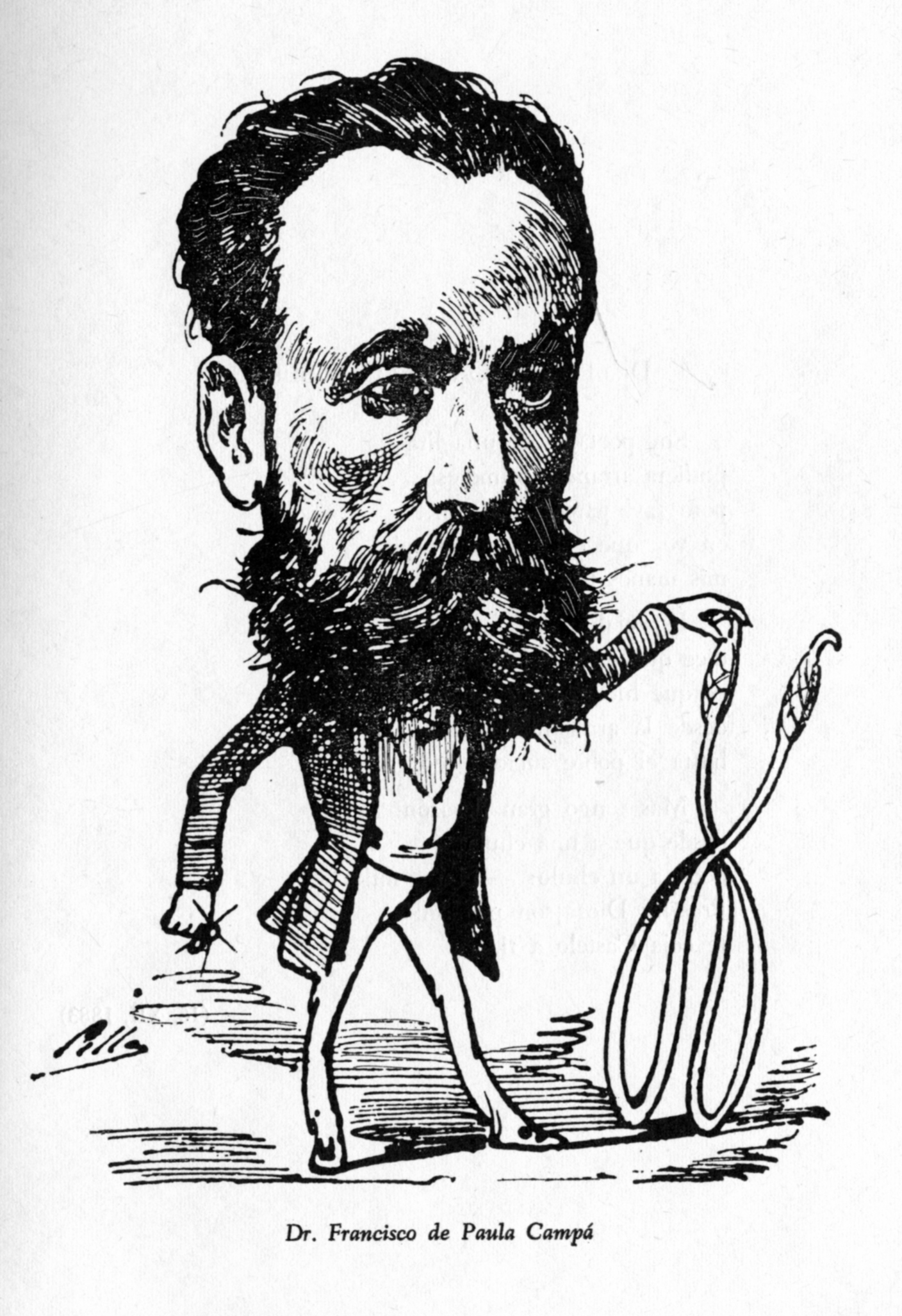 Caricatura del Dr. D. Francisco de Paula Campá (1832 – 1892), por Cilla, sacada del libro del Prof. D. Luís Sánchez Granjel, ‘Biografía de “El Dr. Sangredo” (1883-1884)’, que fue una revista médica del siglo XIX que se subtitulaba “Revista satírica quincenal. Dedicada a los hijos de Esculapio”. Pag. 61.