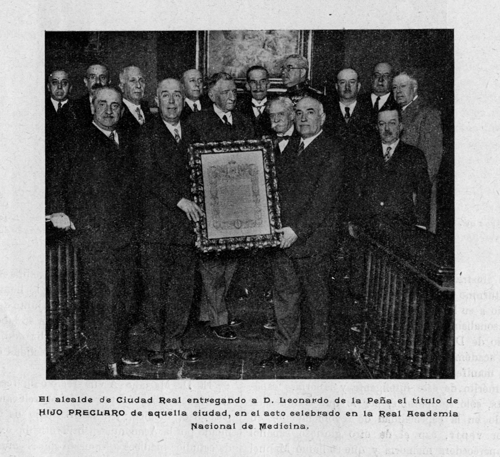 El alcalde de Ciudad Real entregando al Dr. D. Leonardo de la Peña y Díaz (1875 – 1957); a la izquierda de la foto) el título de Hijo Preclaro de aquella ciudad, en el acto celebrado en la Real Academia Nacional de Medicina. El Siglo Médico, T. 87, 1931, pag. 152