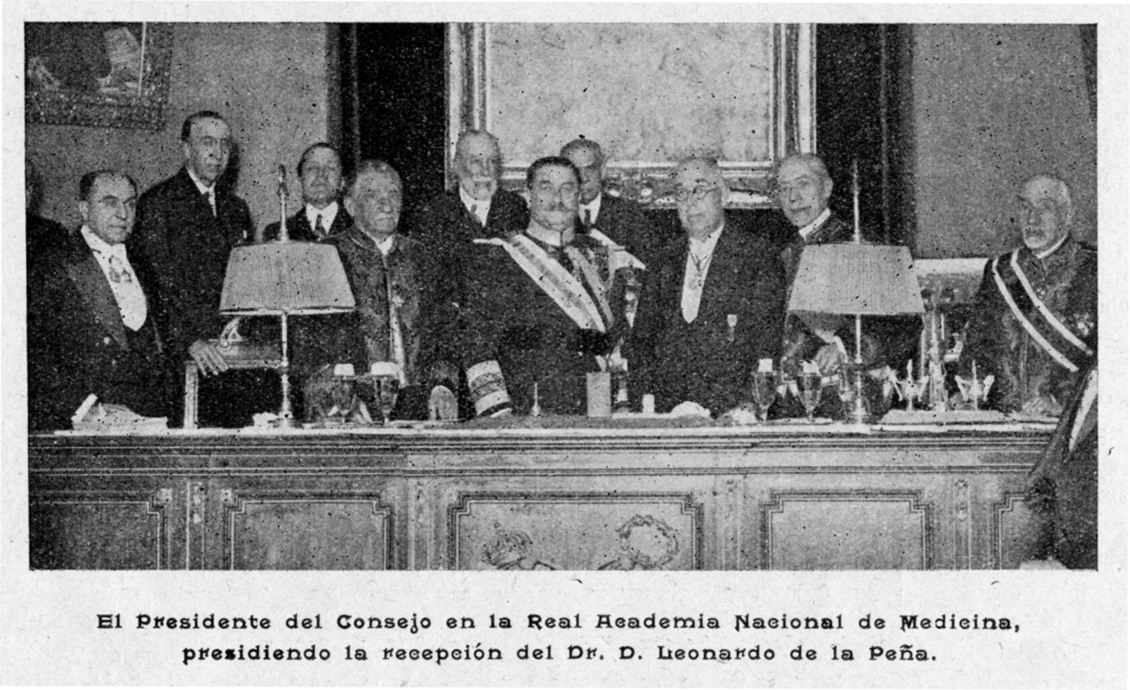 Toma de posesión como Académico de número de la Real Academia Nacional de Medicina del Dr. D. Leonardo de la Peña y Díaz. Presidió el acto el jefe del Gobierno, General D. Dámaso Berenguer y Fusté.