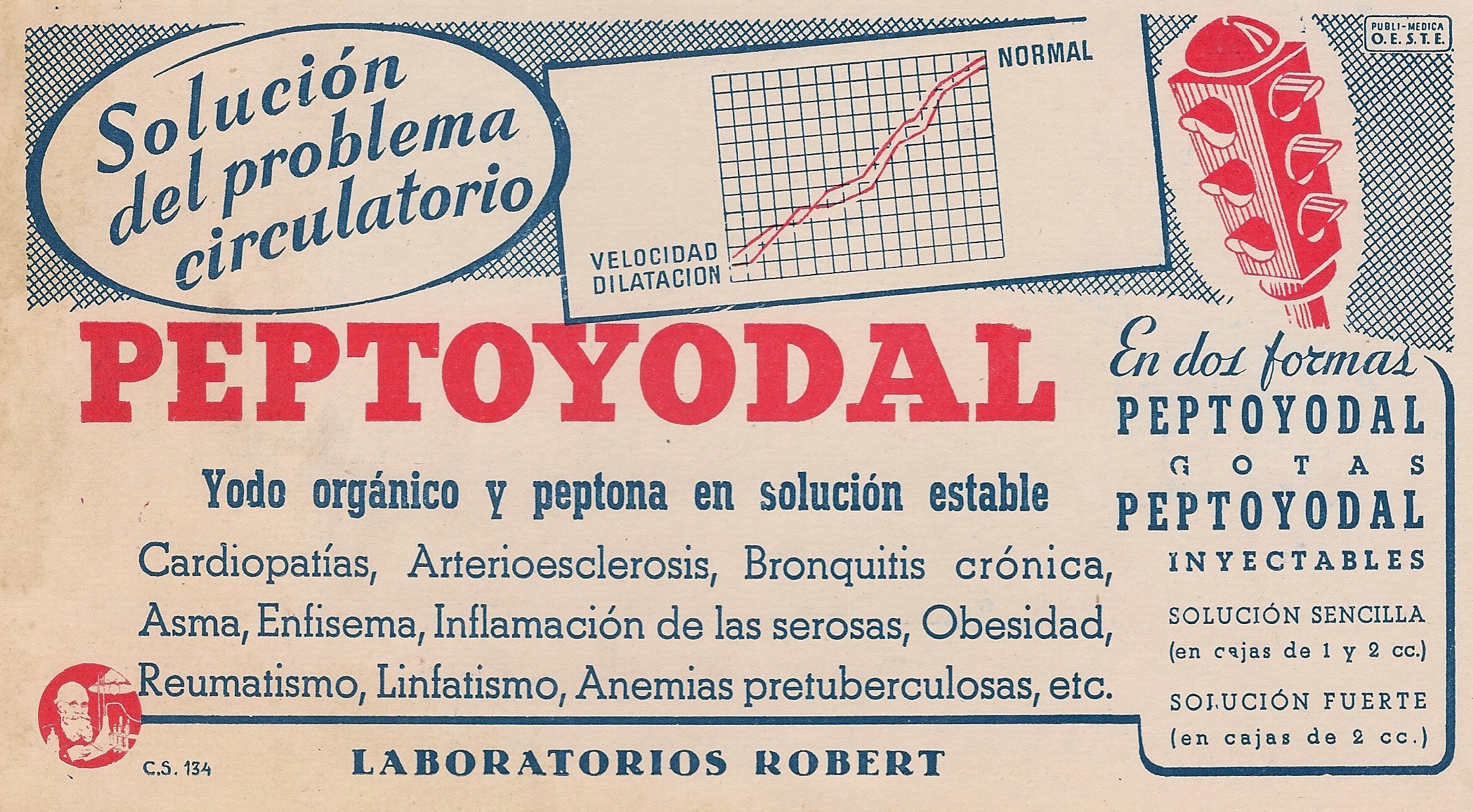 Peptoyodal. Yodo orgánico y pepona en solución estable- Cardiopatías, arteriosclerosis, bronquitis, asma, enfisema, obesidad, reumatismo, etc. Laboratorios Robert. Publicidad aparecida en la portada de Gaceta Médica Española. Noviembre 1953, año XXVII, número 11.