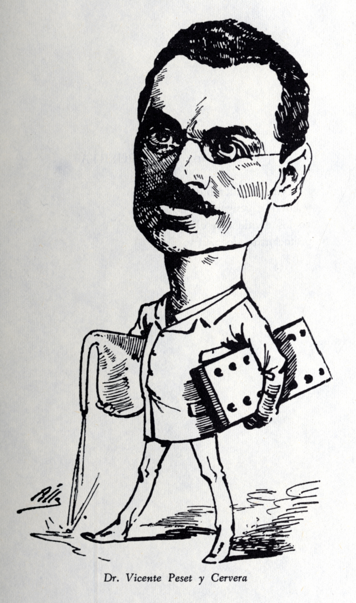Caricatura del Dr. D. Vicente Peset y Cervera (1855 – 1945) , por Cilla, sacada del libro del Prof. D. Luís Sánchez Granjel, ‘Biografía de “El Dr. Sangredo” (1883-1884)’, que fue una revista médica del siglo XIX que se subtitulaba “Revista satírica quincenal. Dedicada a los hijos de Esculapio”. Pag. 117.