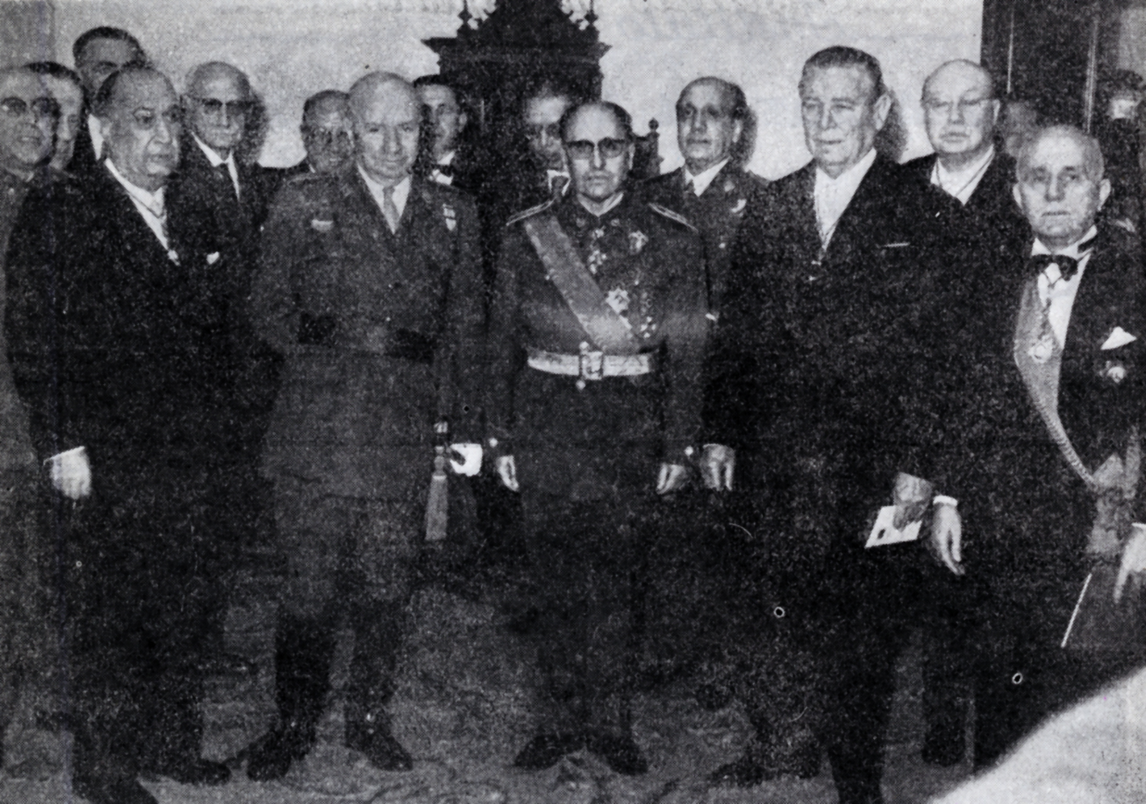 El nuevo Académico de la Real Academia de Medicina, Prof. Gonzalo Piédrola Gil, a la entrada del salón de actos, acompañado a su derecha por el Sr. Ministro del Ejército, a su izquierda por el Presidente de la Corporación, Prof. Palanca, y por varios señores Académicos.