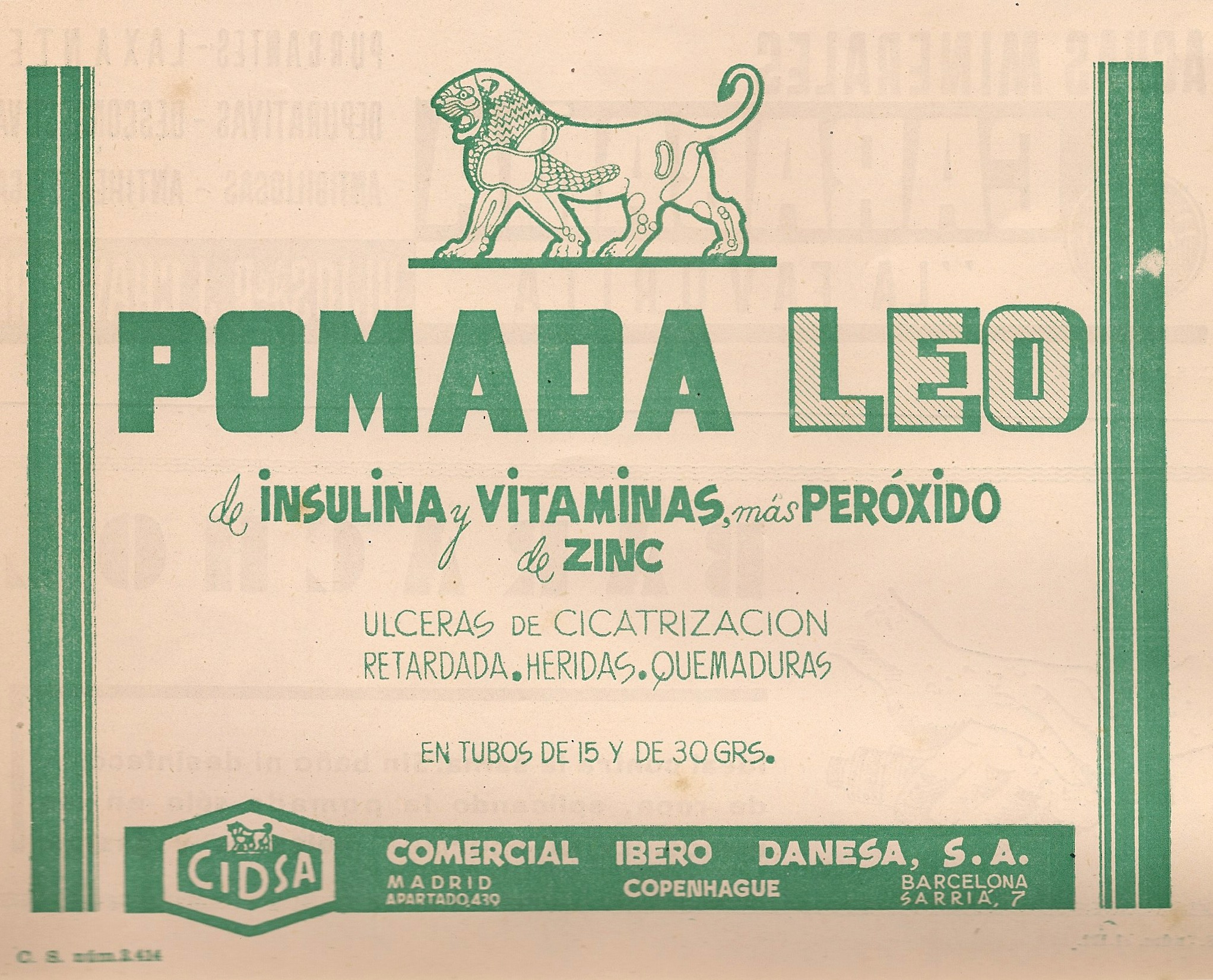 Pomada Leo. Insulina, vitaminas y peróxido de Zinc. Úlceras, heridas, quemaduras. Cidsa. Comercial Ibero Danesa SA. Madrid, Barcelona, Copenhague. Publicidad aparecida en la revista Gaceta Médica Española. Año 18, número 1, 1944.