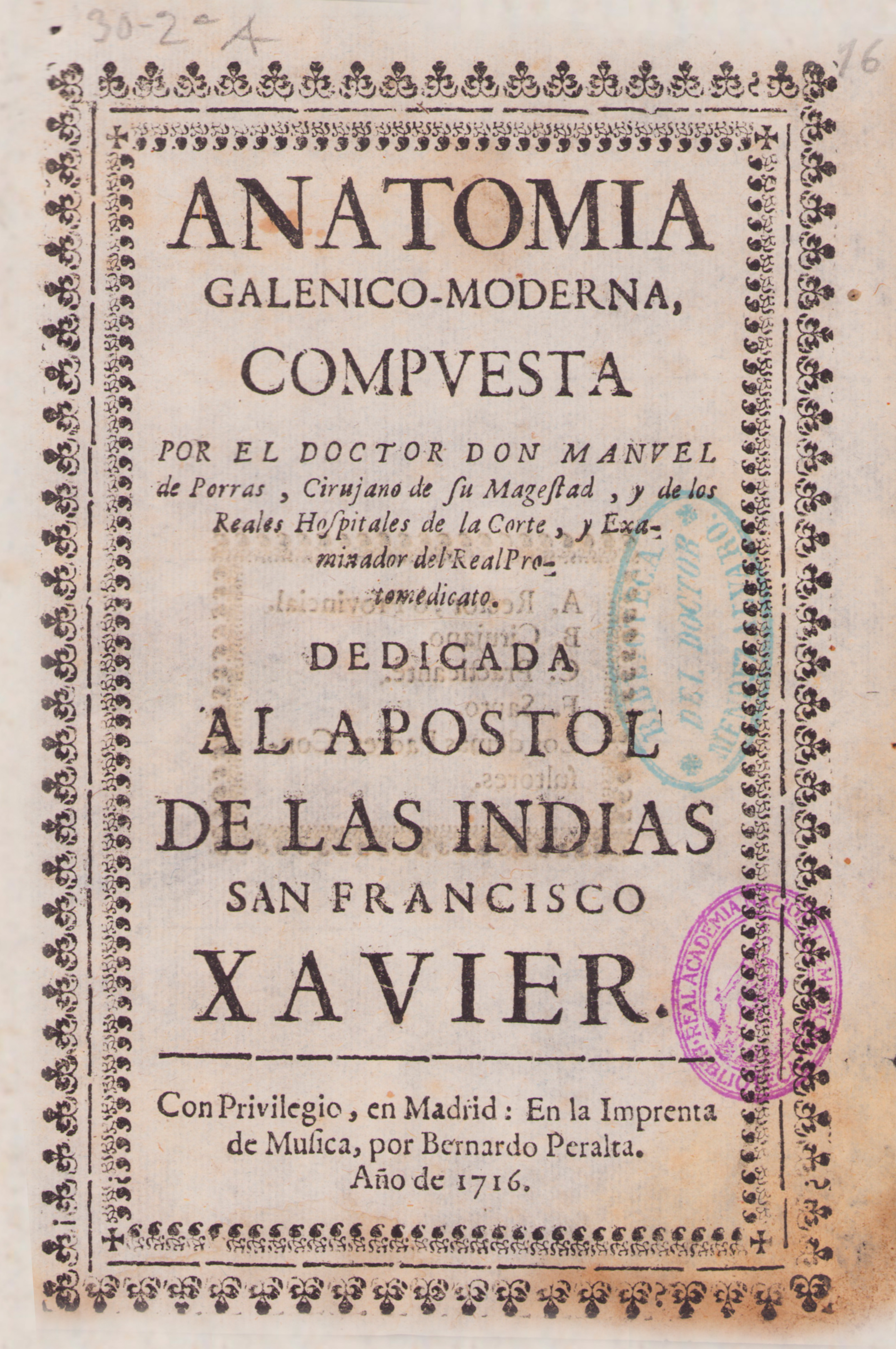 Portada “Anatomía Galenico-Moderna, compvesta por el doctor Don Manvel de Porras”
