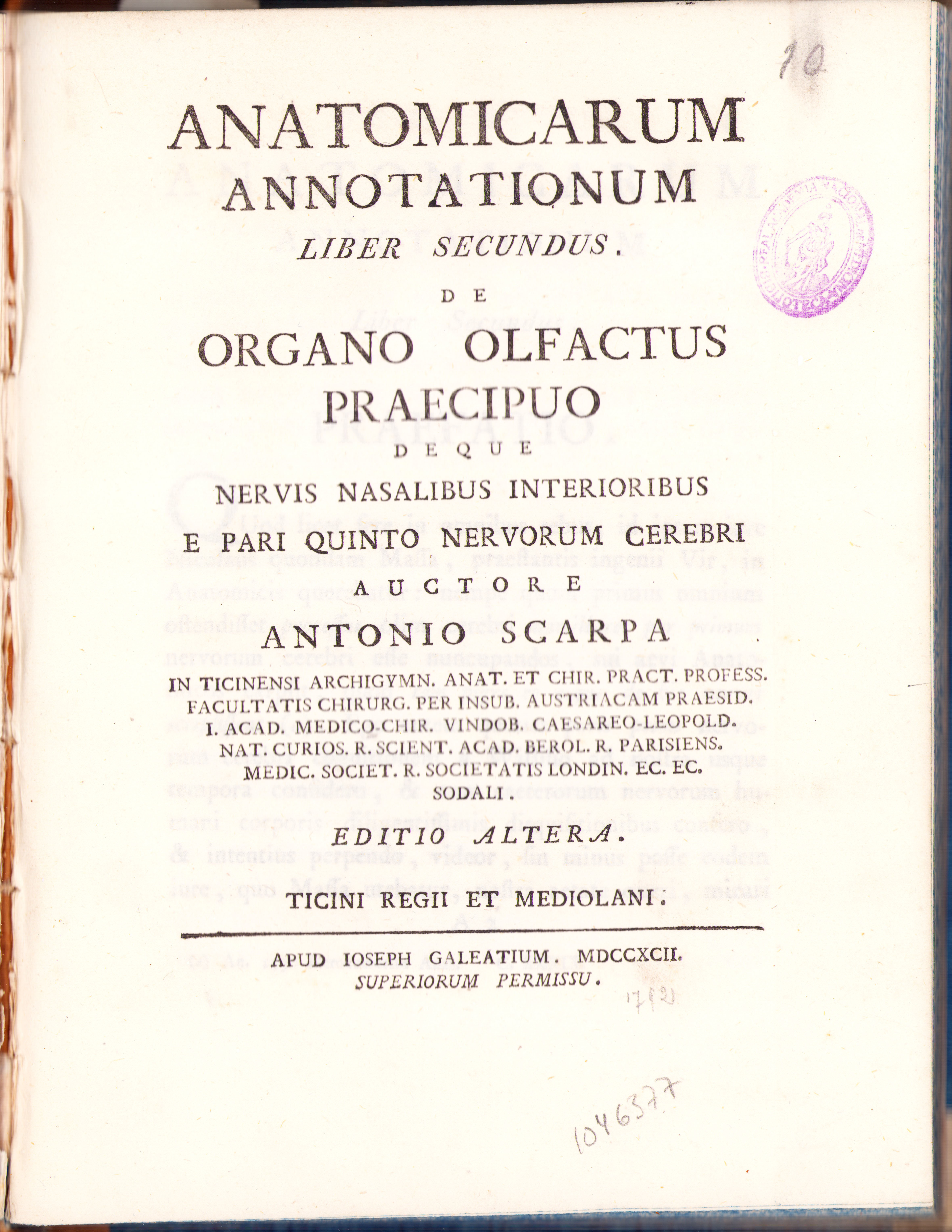 Portada de: Anatomicarum annotationum liber secundus de organo olfactus praecipuo deque nervis nasalibus interioribus e pari quinto nerviorum cerebri.