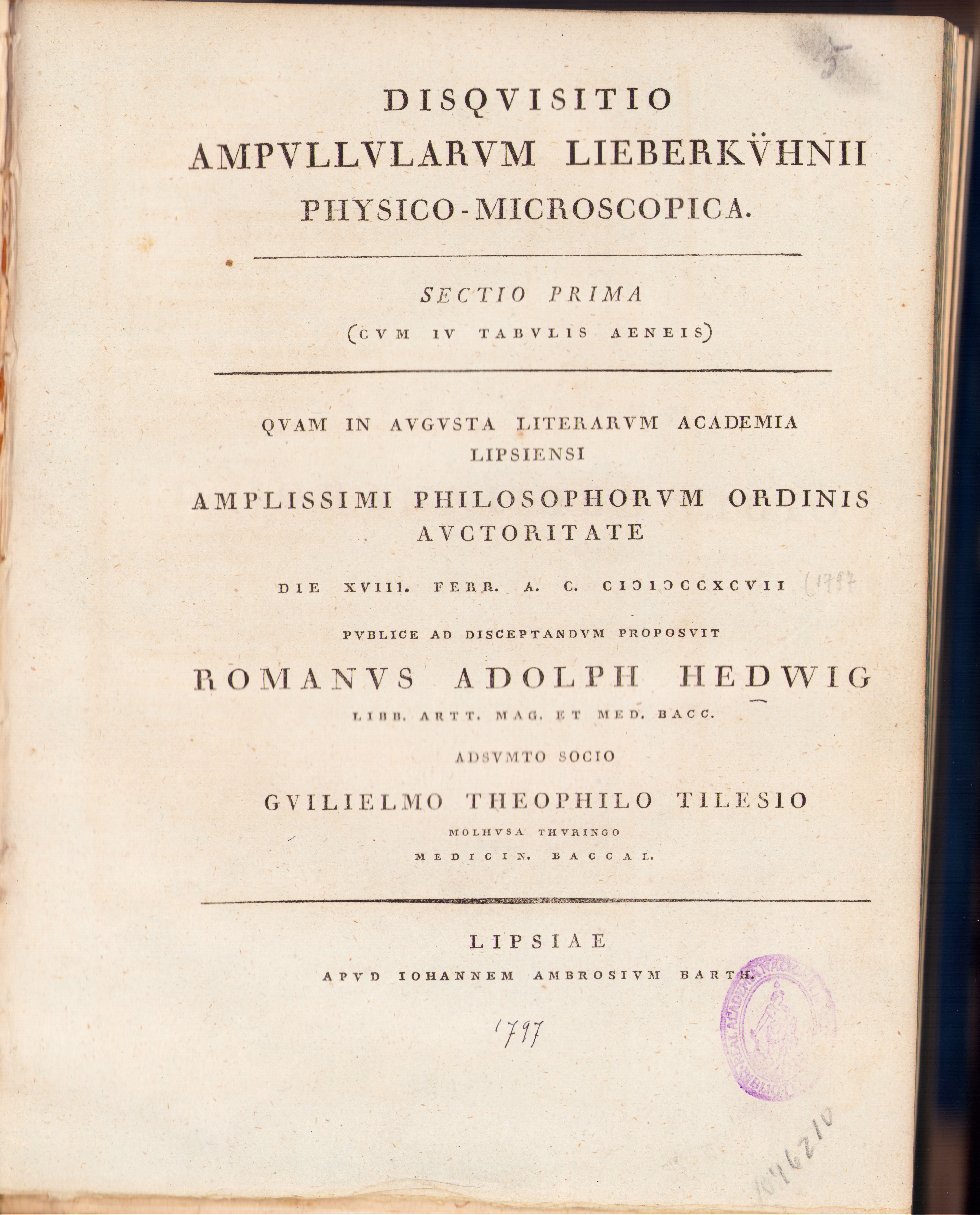 Portada de: Disqvisitio ampvllvlarvm lieberkvhnii physico-microscopia. Section prima