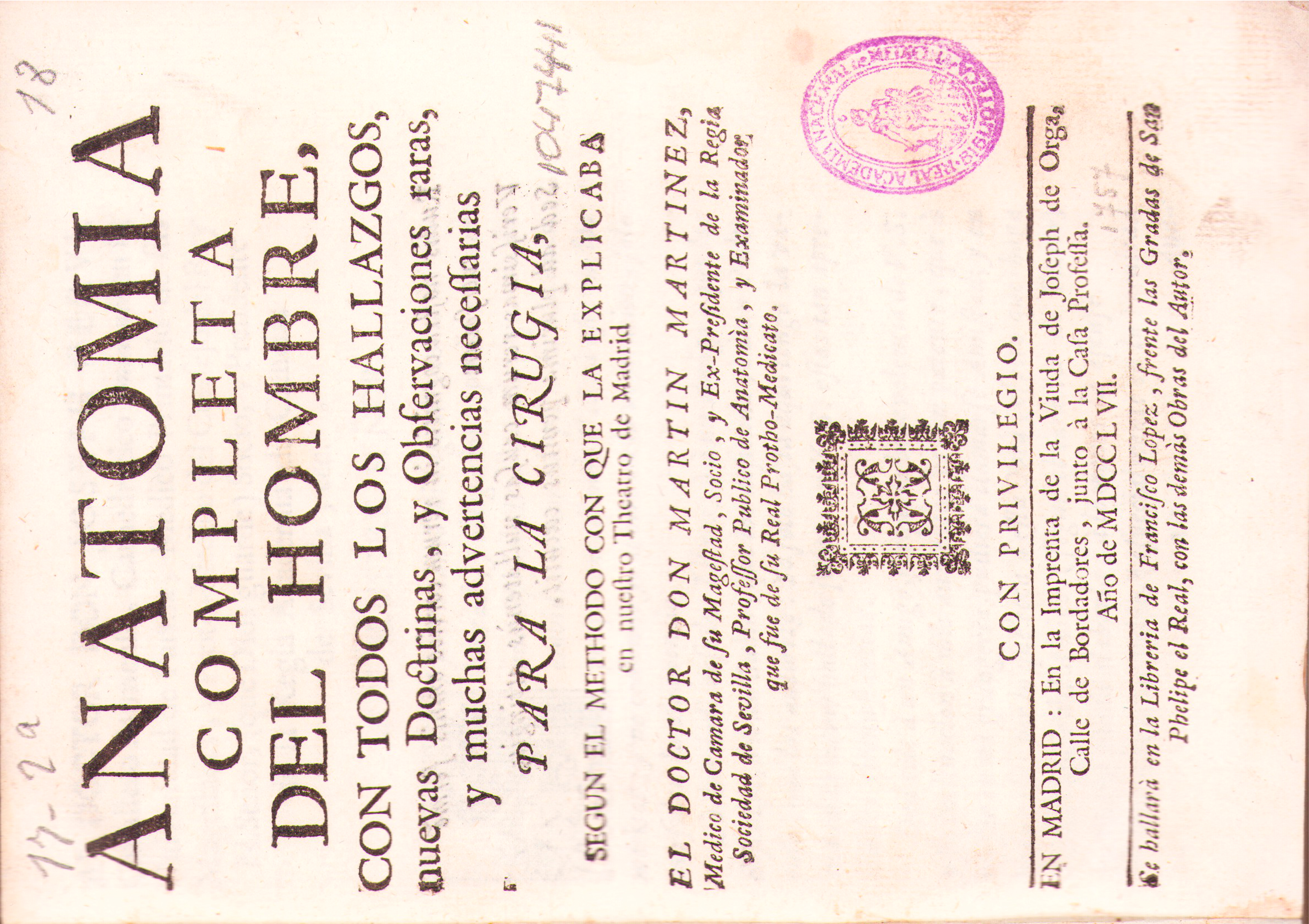 Portada del libro “Anatomía completa del hombre, con todos los hallazgos, nuevas Doctrinas y observaciones raras y muchas advertencias neceffarias para la cirugía.”