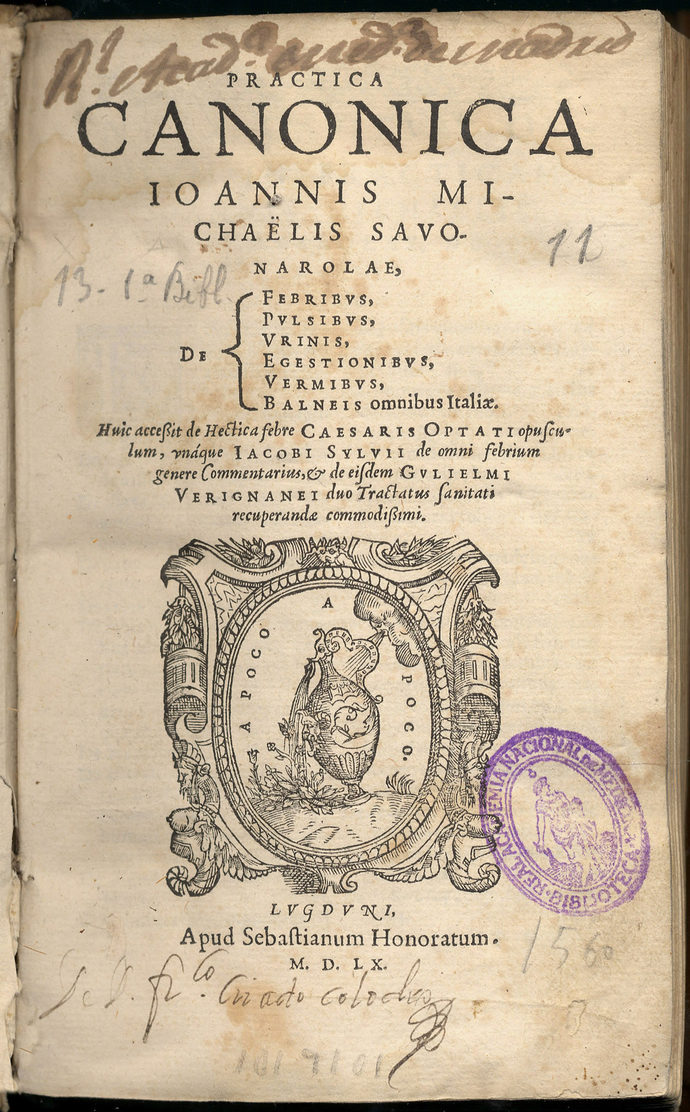 SAVONAROLA, Michele (ca. 1384 – ca. 1462). – Practica canonica… – Lugduni : apud Sebastianum Honoratum : excudebat Iacobus Faurus, 1560. – [16], 1119 p. ; 8º [17 cm.]. – Perg.