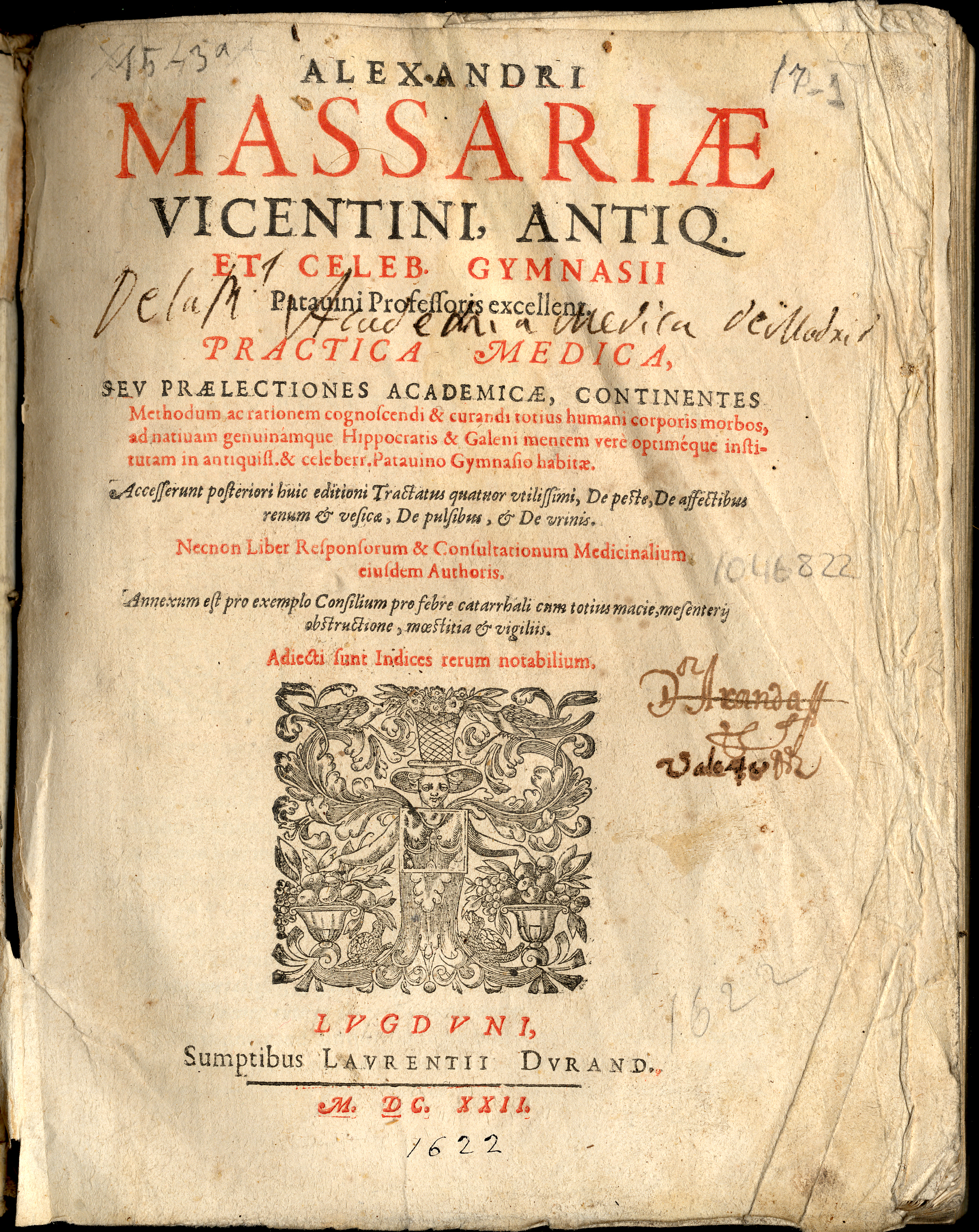MASSARIA, Alessandro. – Practica medica… – Lugduni : sumptibus Laurentii Durand, 1622. – [12], 968 p. ; 4º