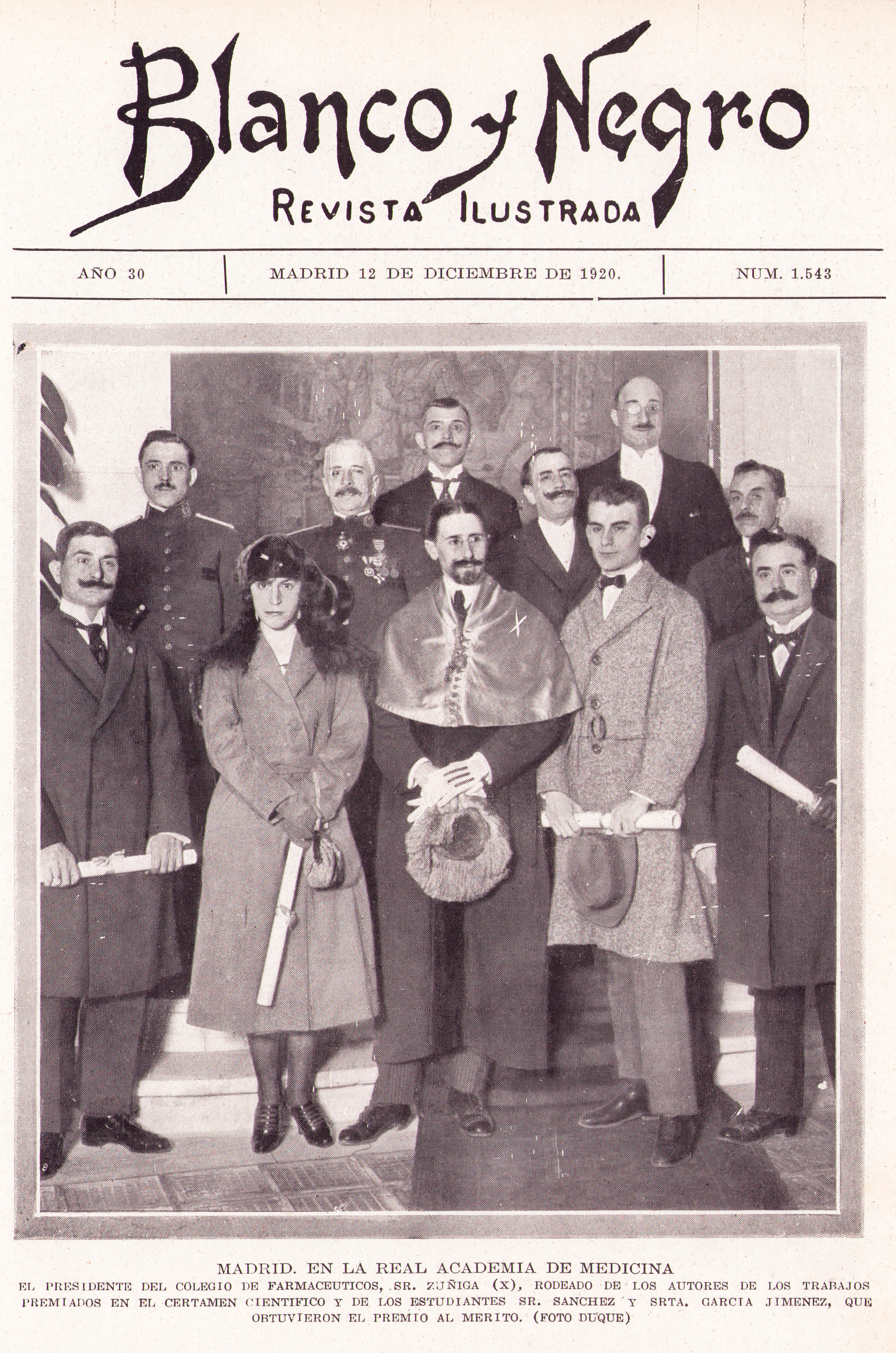 Madrid. En la real academia de medicina. El presidente del colegio de farmaceuticos, Sr. Zuniga (x), rodeado de los autores de los trabajos Srta. Garcia Jimenez, que premiados en el certamen cientifico y de los estudiantes Sr. Sanchez y obtuvieron el premio al merito. (foto Duque)