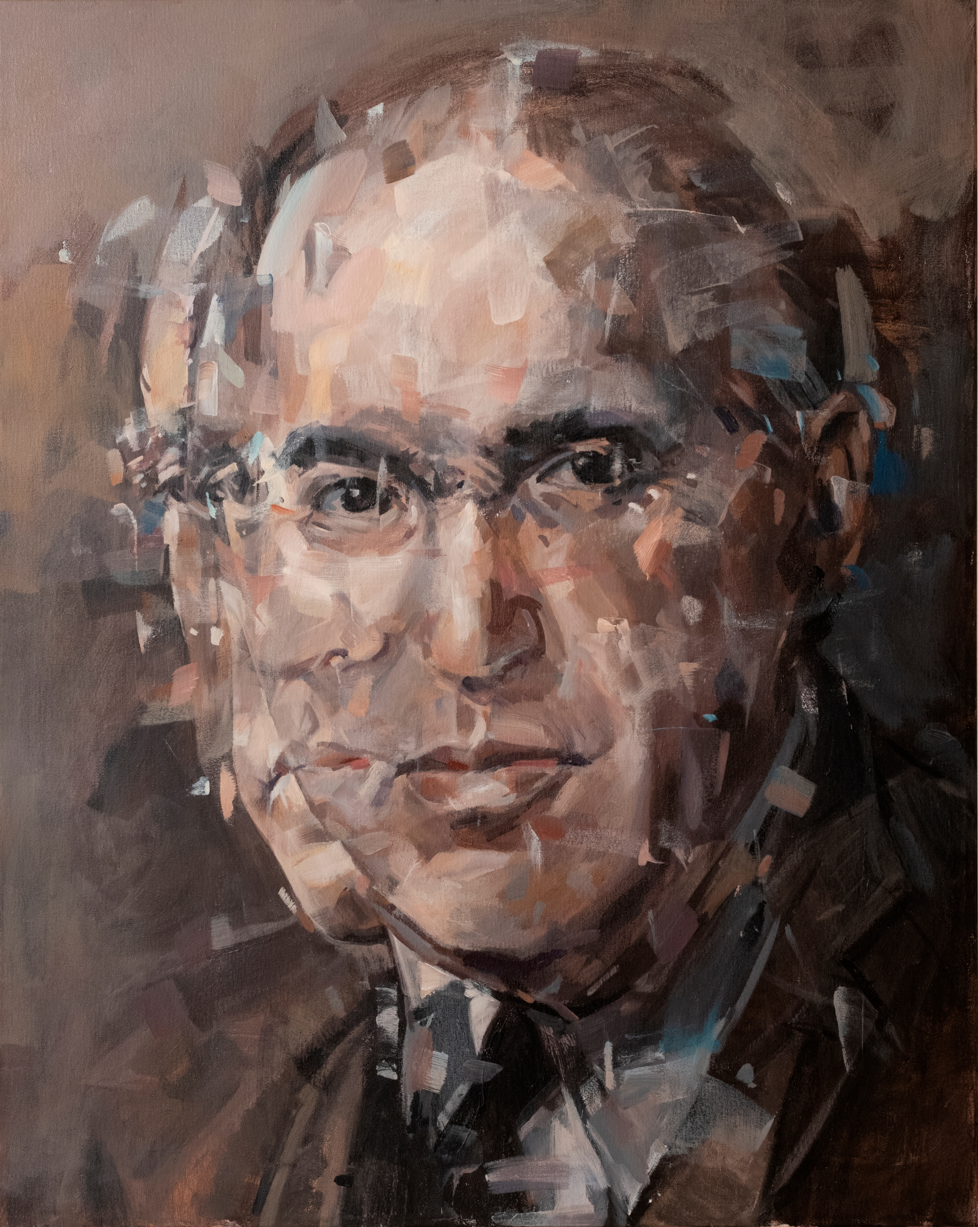 Cristina Pollesel. Todas las miradas. Técnica mixta sobre lienzo (65 x 81 cm). Obra ganadora del II Premio de Pintura RANME, celebrado en 2022, con el tema “Retrato del médico humanista D. Gregorio Marañon (1887-1960)”.