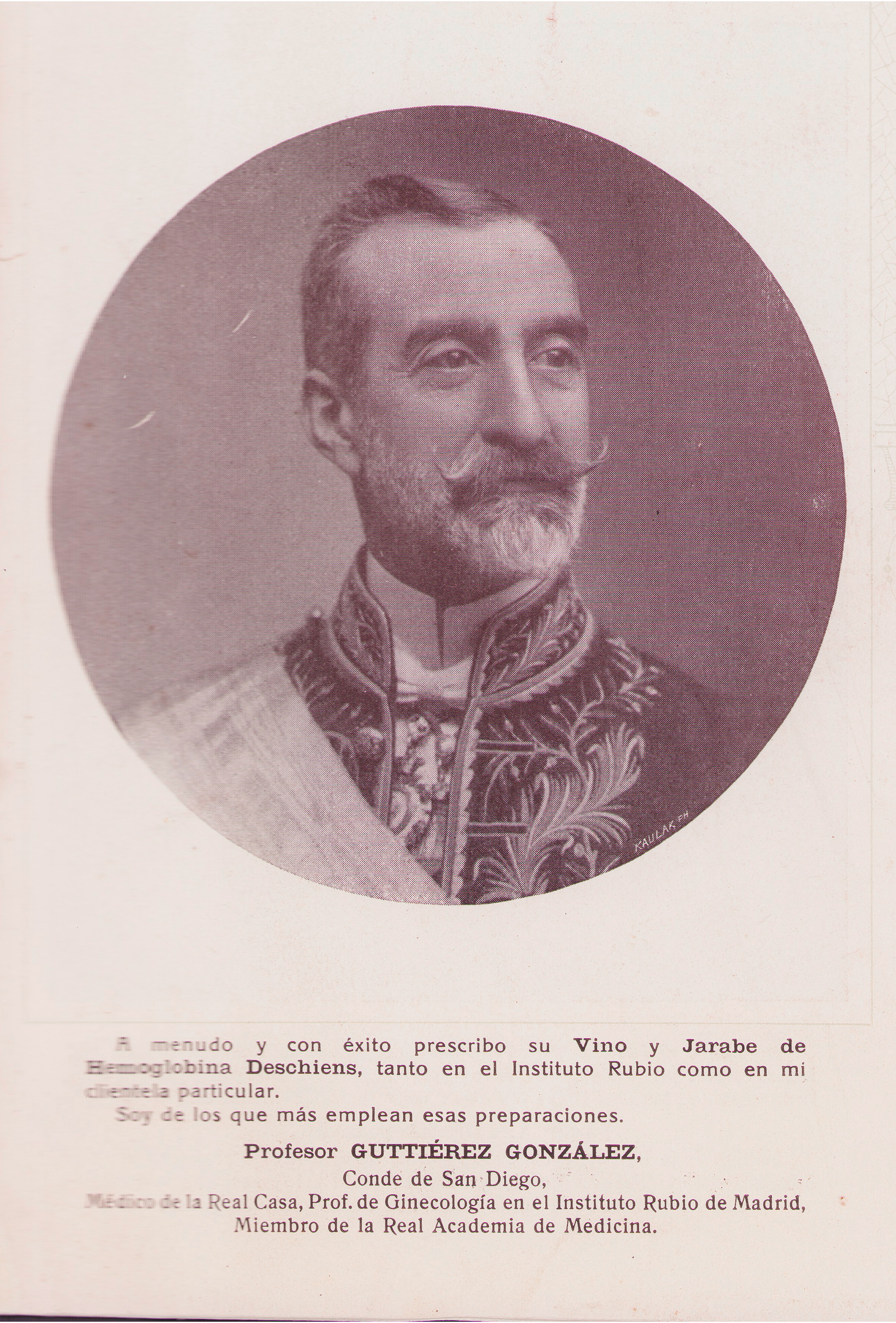 Profesor GUTTIÉREZ GONZÁLEZ, conde de San Diego, médico de la Real Casa, Prof. de Ginecología en el Instituto Rubio de Madrid, Miembro de la Real Academia de Medicina.