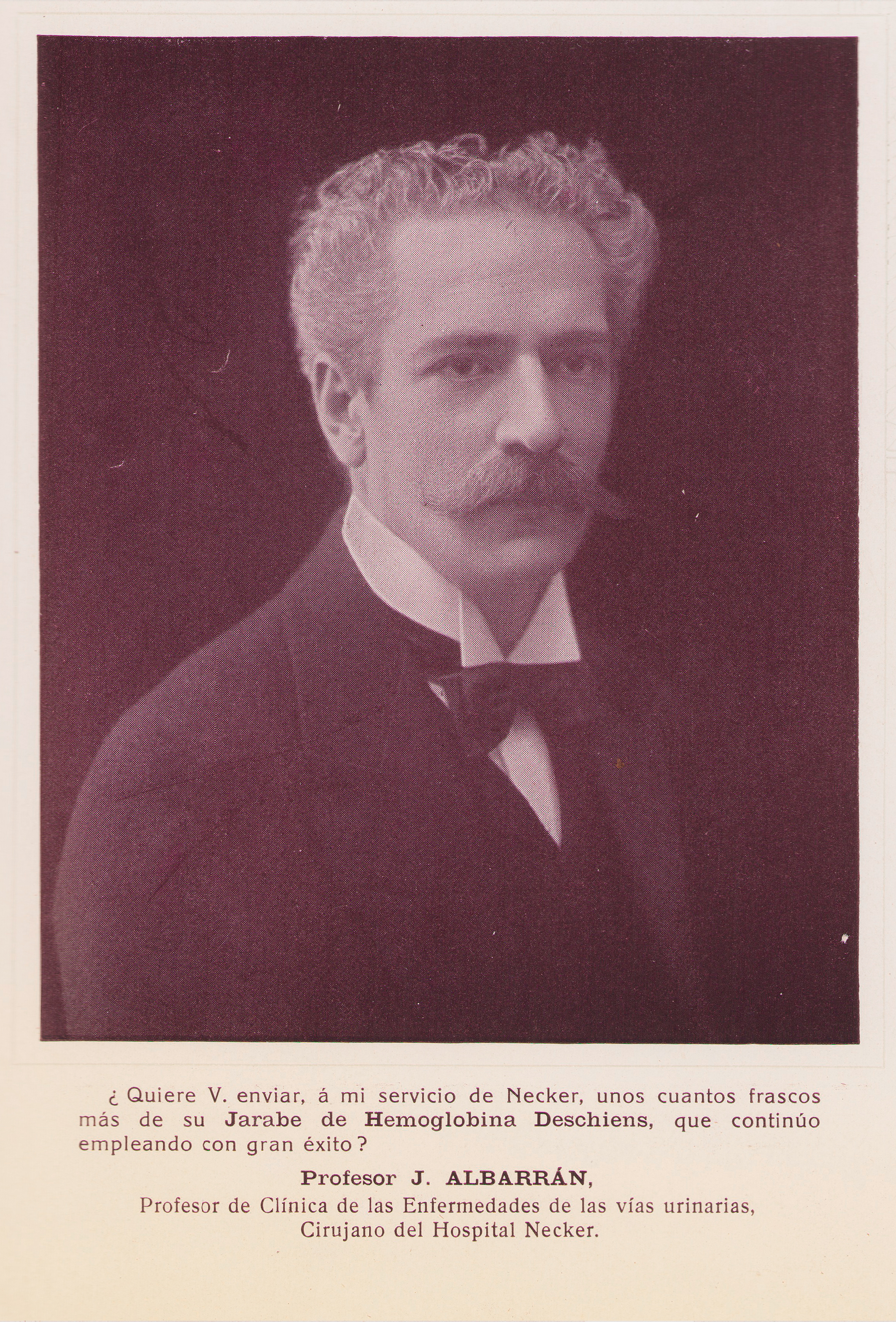 “¿Quiere V. enviar, á mi servicio de Necker, unos cuantos frascos más de su Jarabe de Hemoglobina Deschiens, que continúo empleando con gran éxito?”