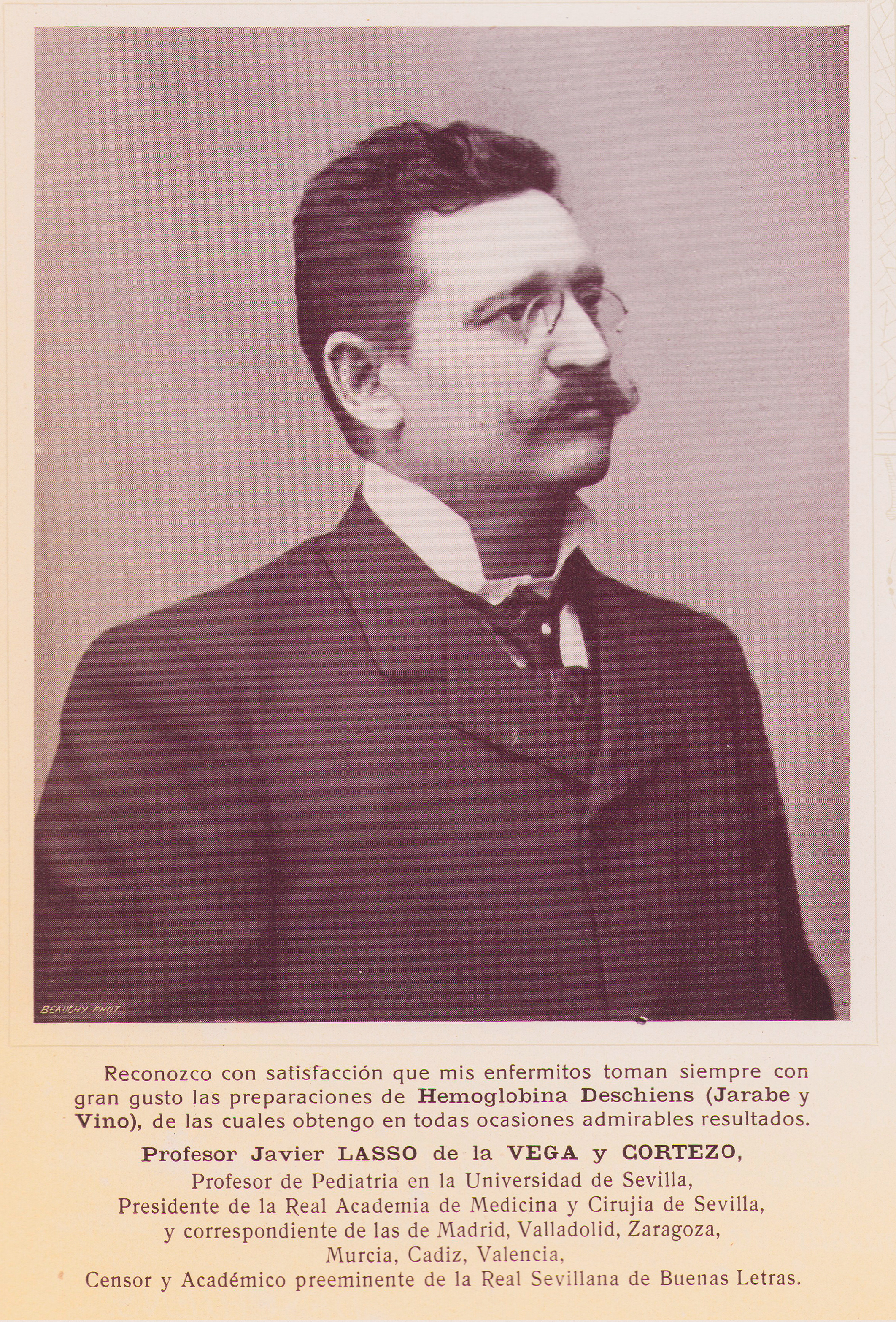 Profesor Javier LASSO de la VEGA Y CORTEZO, Profesor de Pediatria en la Universidad de Sevilla, Presidente de la Real Academia de Medicina y Cirujia de Sevilla, y correspondiente de las de Madrid, Valladolid, Zaragoza, Murcia, Cadiz, Valencia, Censor y Académico preeminente de la Real Sevillana de Buenas Letras.