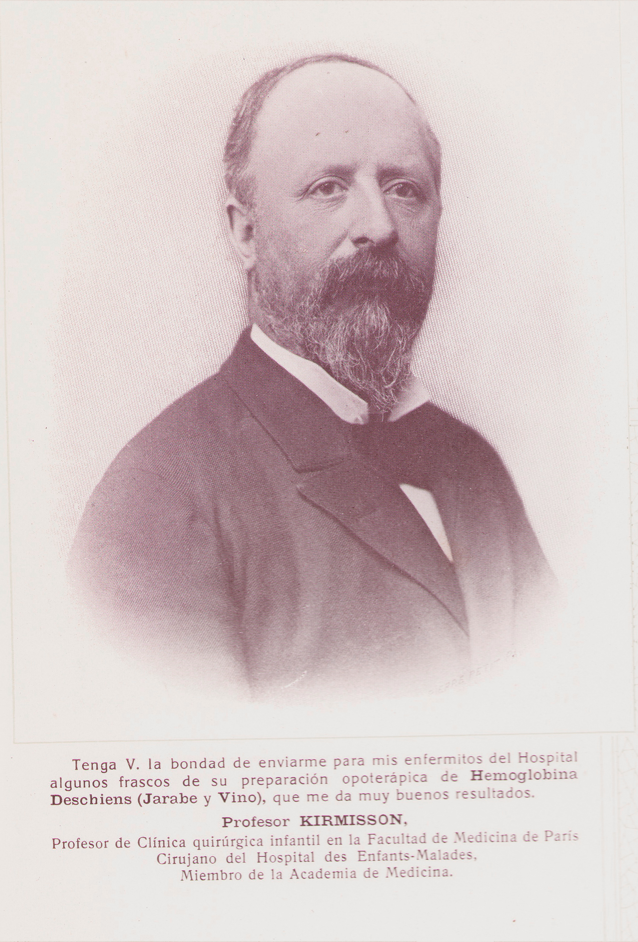 Tenga V. la bondad de enviarme para mis enfermitos del Hospital algunos frascos de su preparación opoterápica de Hemoglobina Deschiens (Jarabe y Vino), que me da muy buenos resultados