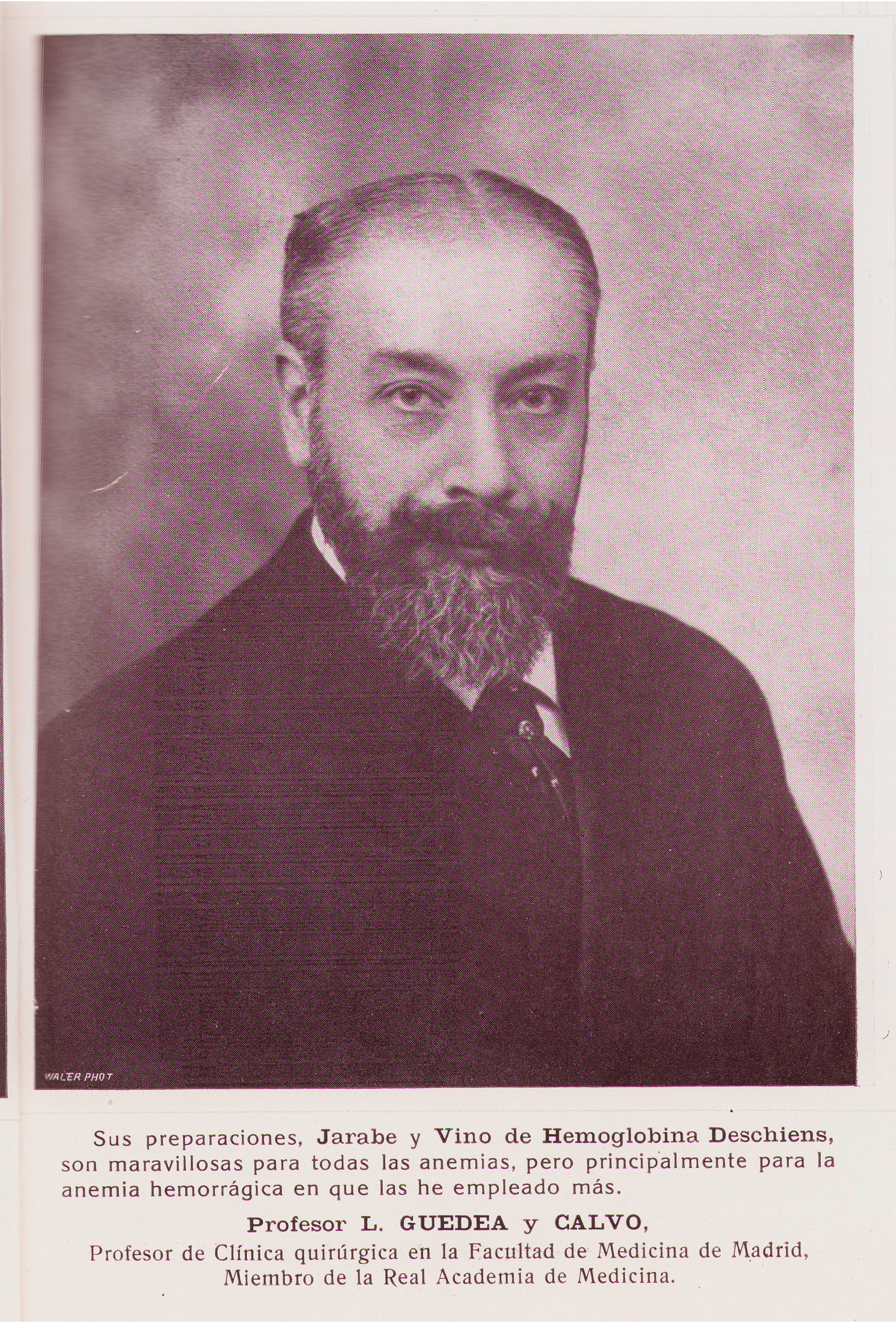 Sus preparaciones, Jarabe y Vino de Hemoglobina Deschiens, son maravillosas para todas las anemias, pero principalmente para la anemia hemorrágica en que las he empleado más. Profesor L. GUEDEA y CALVO, Profesor de Clinica quirúrgica en la Facultad de Medicina de Madrid, Miembro de la Real Academia de Medicina.