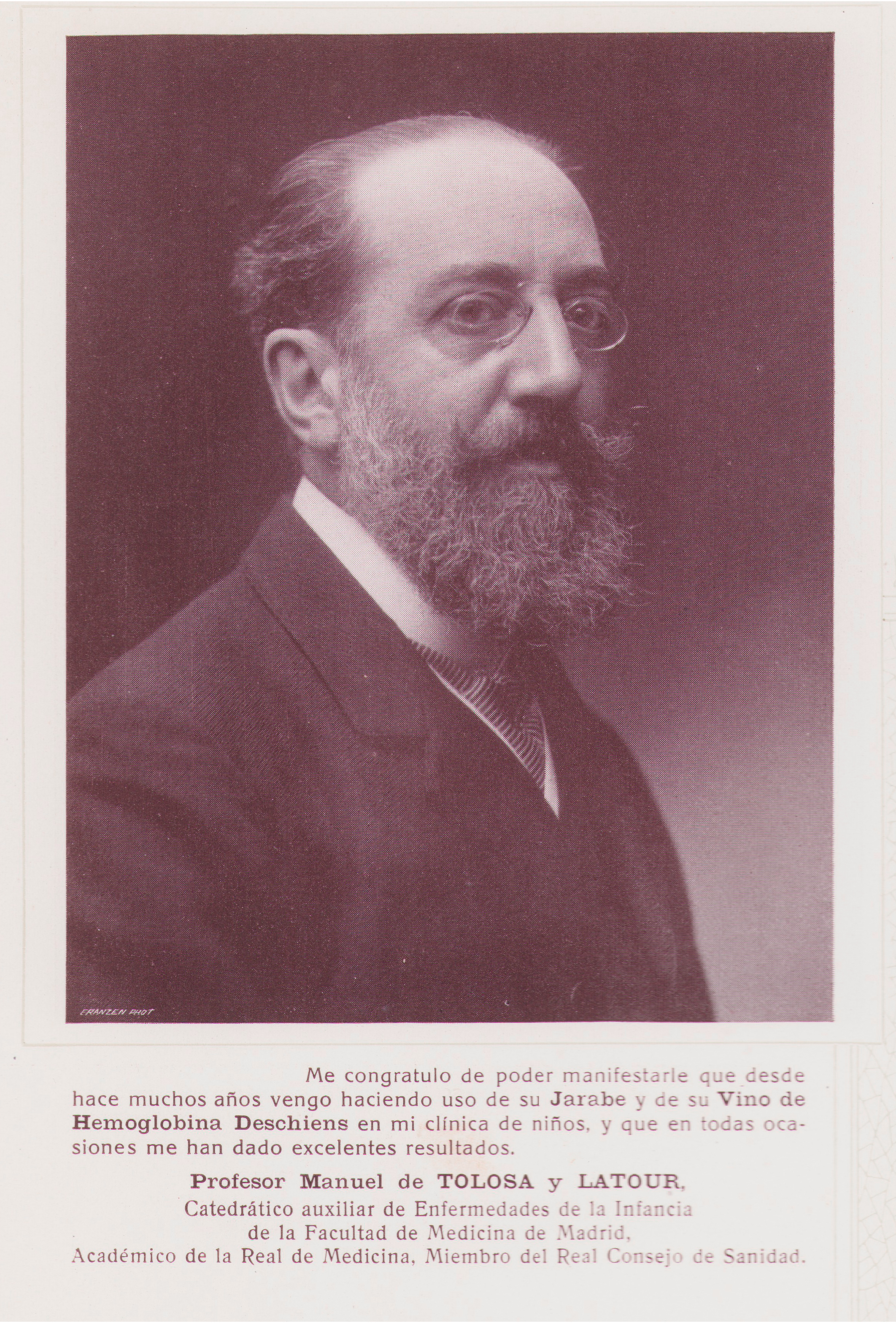 Me congratulo de poder manifestarle que desde hace muchos años vengo haciendo uso de su Jarabe y de su Vino de Hemoglobina, Deschiens en mi clinica de niños, y que en todas ocasiones me han dado excelentes resultados. Profesor Manuel de TOLOSA y LATOUR Catedrático auxiliar de Enfermedades de la Infancia de la Facultad de Medicina de Madrid, Académico de la Real de Medicina, Miembro del Real Consejo de Sanidad.