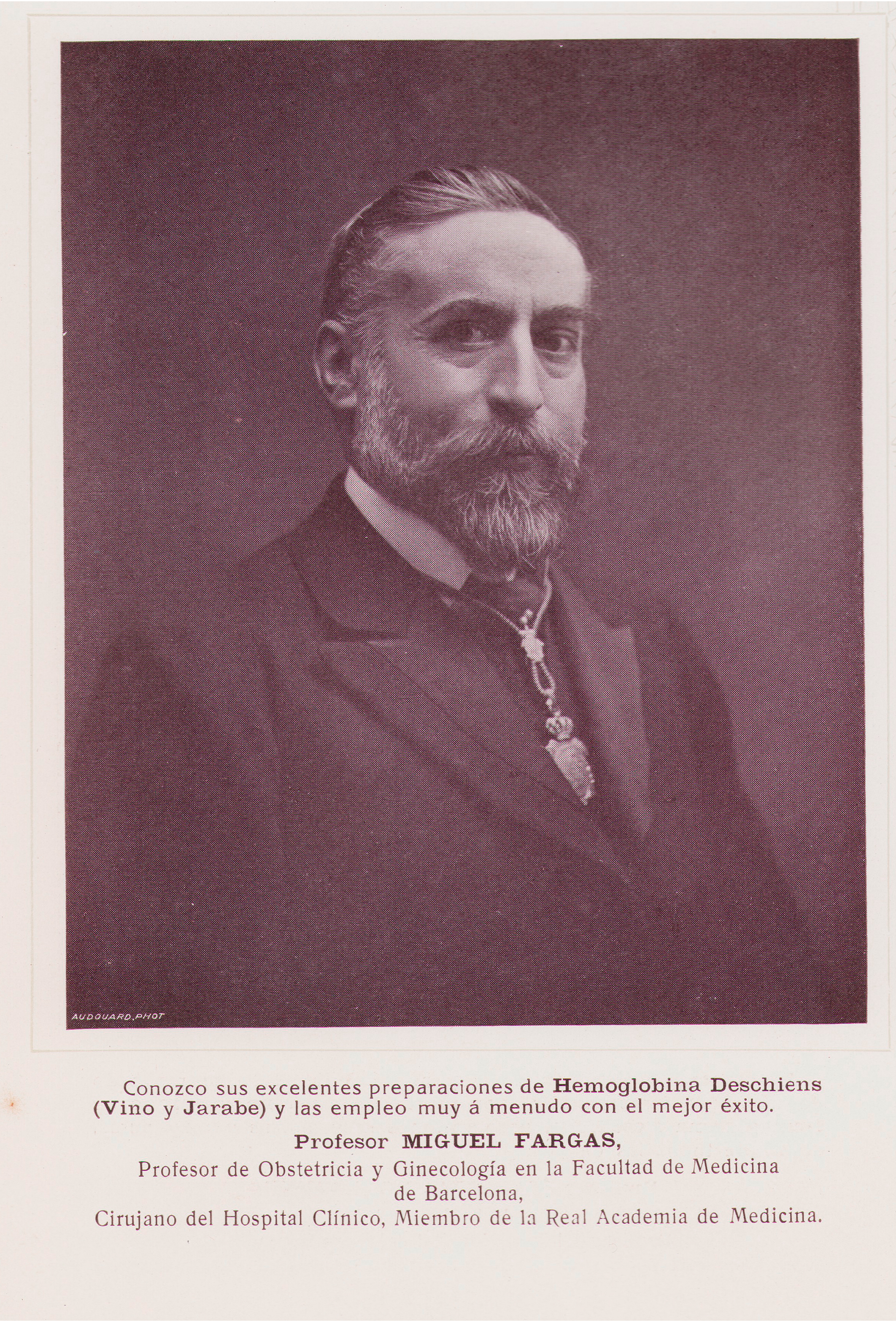 Profesor MIGUEL FARGAS, Profesor de Obstetricia y Ginecologia en la Facultad de Medicina de Barcelona, Cirujano del Hospital Clinico, Miembro de la Real Academia de Medicina.