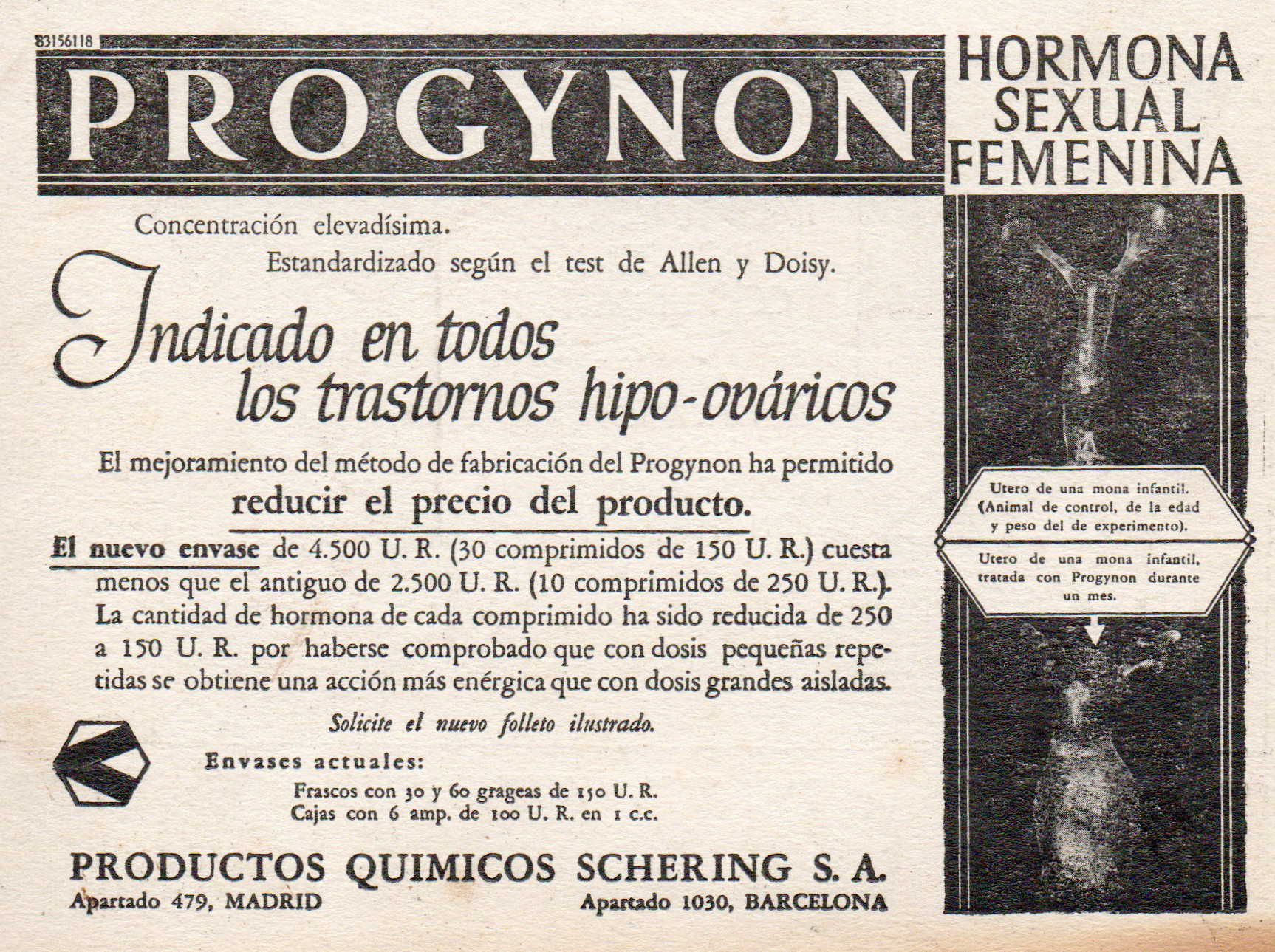 Progynon. Hormona sexual femenina. Indicado en los tratornos hipo-ováricos. Productos Químicos Schering S.A. La Medicina Ibera, 11 de abril de 1931.