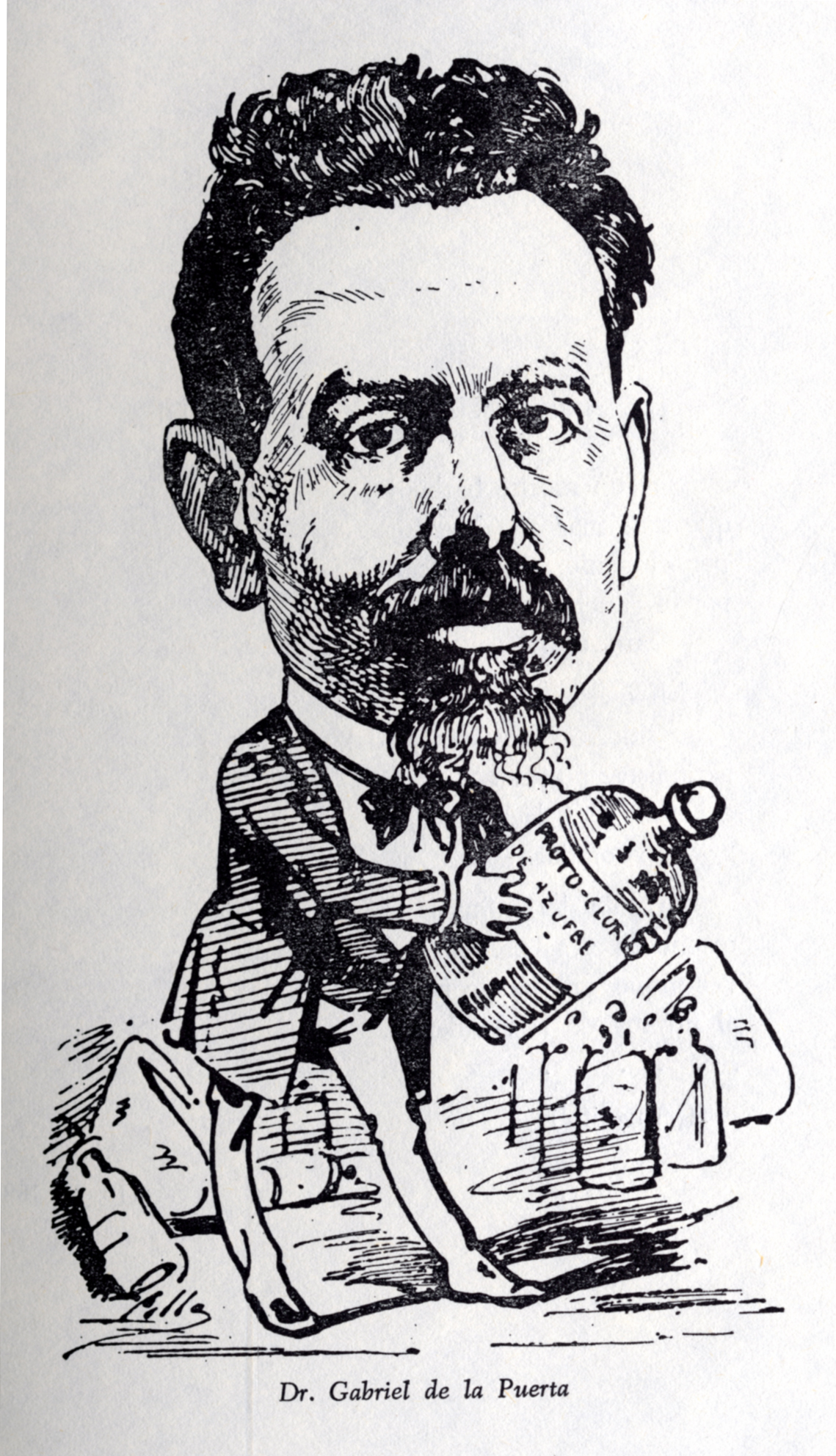 Caricatura del Dr. D. Gabriel de la Puerta Ródenas (1839 – 1908) , por Cilla, sacada del libro del Prof. D. Luís Sánchez Granjel, ‘Biografía de “El Dr. Sangredo” (1883-1884)’, que fue una revista médica del siglo XIX que se subtitulaba “Revista satírica quincenal. Dedicada a los hijos de Esculapio”. Pag. 119.