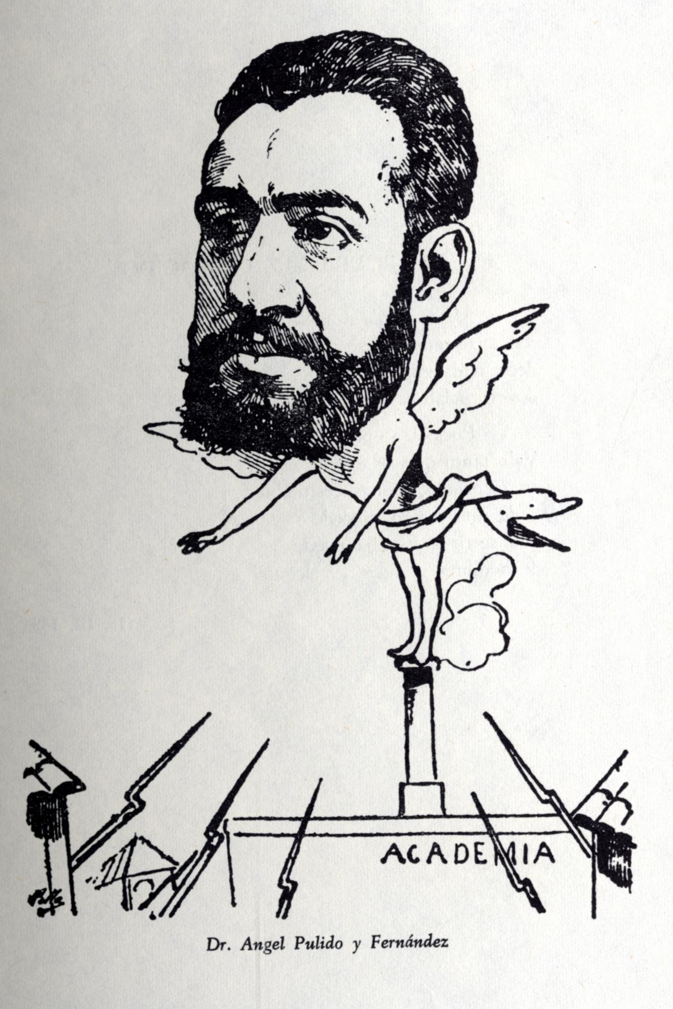 Caricatura del Dr. D. Angel Pulido Fernández (1852 – 1932) , por Cilla, sacada del libro del Prof. D. Luís Sánchez Granjel, ‘Biografía de “El Dr. Sangredo” (1883-1884)’, que fue una revista médica del siglo XIX que se subtitulaba “Revista satírica quincenal. Dedicada a los hijos de Esculapio”. Pag. 121.