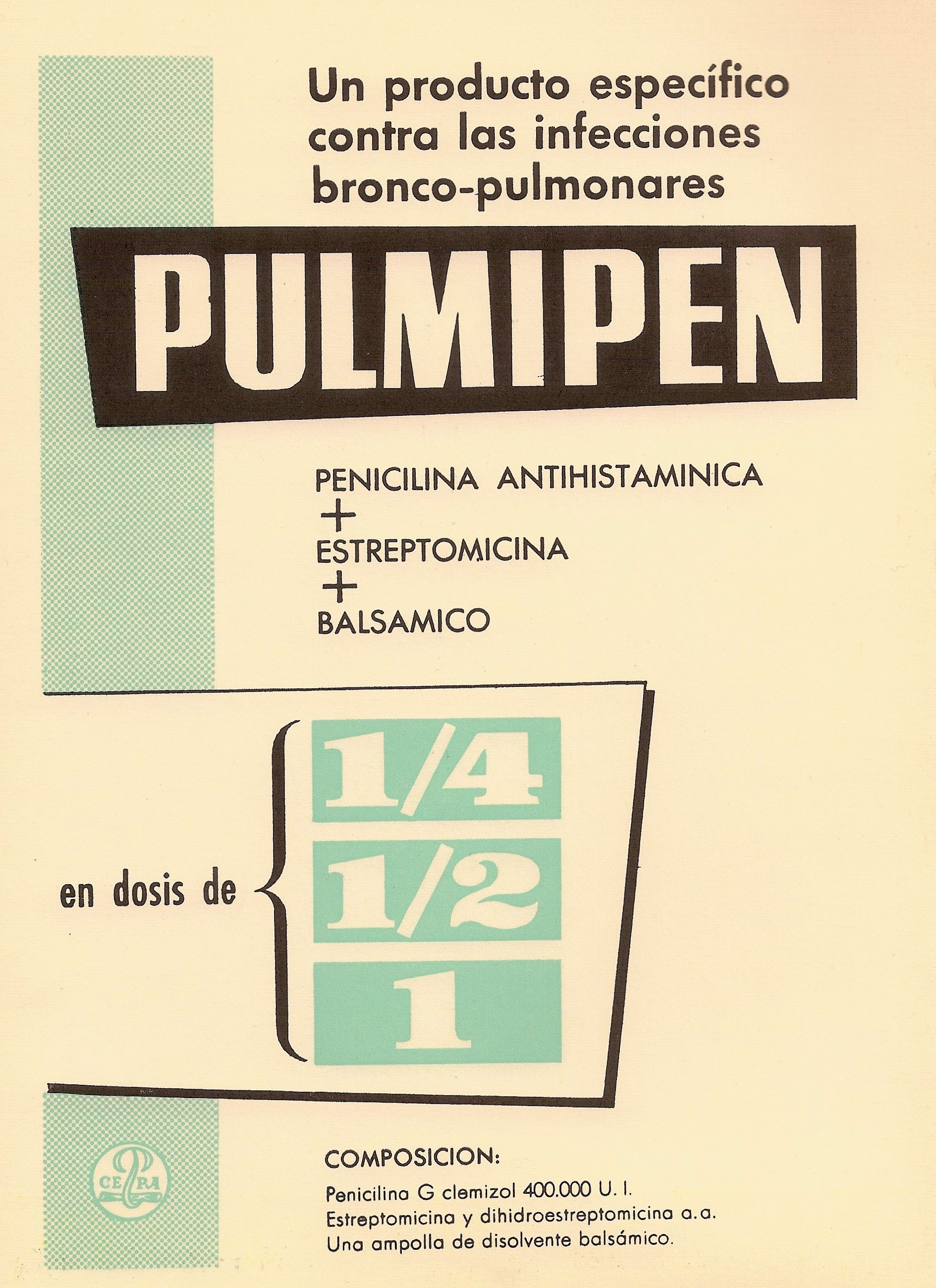 Pulmipen. Penicilina antihistiamina, estreptomicina y blsámico. Producto específico contra las infecciones pulmonares. CEPA. Archivos de la Facultad de Medicina de Madrid, 1964.