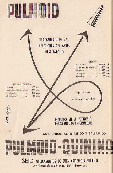 Pulmoid. Pulmoid-Quinina. Tratamiento de las afecciones del árbol respiratorio. SEID, Barcelona. Progresos de Patología Clínica, 1954.