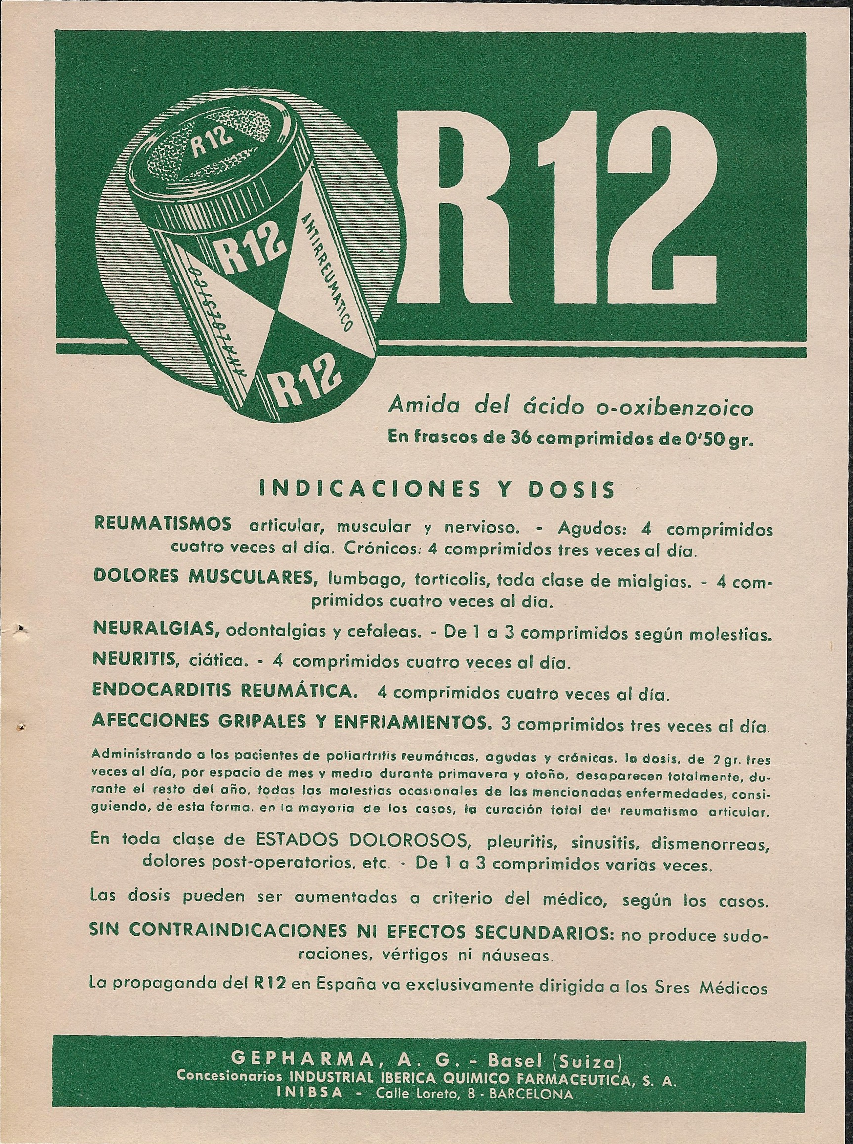 R 12. Amiga del ácido o-oxibenzóico. Reumatismos, dolores musculares, neuralgias, endocarditis reumática, neuritis. Industrial Ibérica Químico Farmacéutica. Barcelona. Encarte publicitario aparecido en Gaceta Médica Española. Noviembre 1953, año XXVII, número 11.