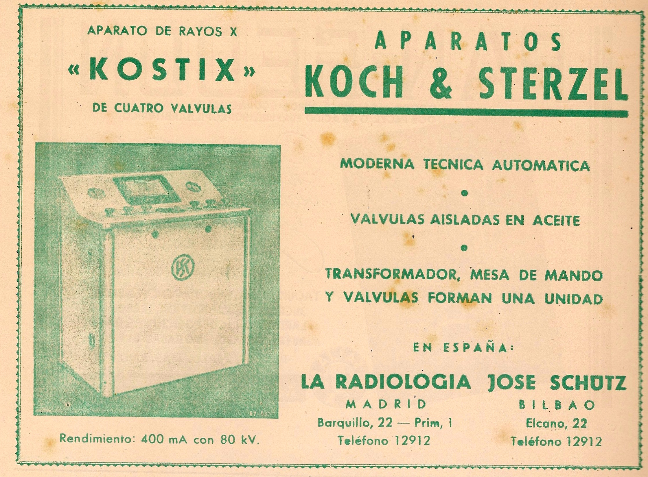 Rayos X Kostix. Aparatos Koch & Sterzel. Radiología José Schütz. Madrid, Bilbao. Publicidad aparecida en la revista Gaceta Médica Española. Año 18, número 1, 1944.