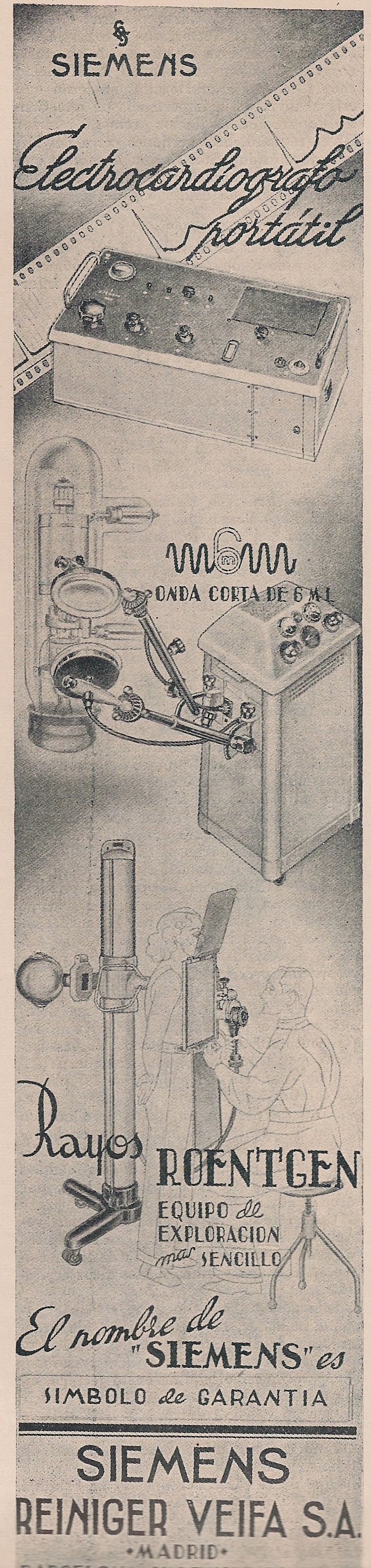 Rayos Roentgen. Electrocardiógrafo. Onda cota. Siemens Reiniger Veifa SA. Madrid. Publicidad aparecida en la revista Gaceta Médica Española. Año 18, número 3, 1944