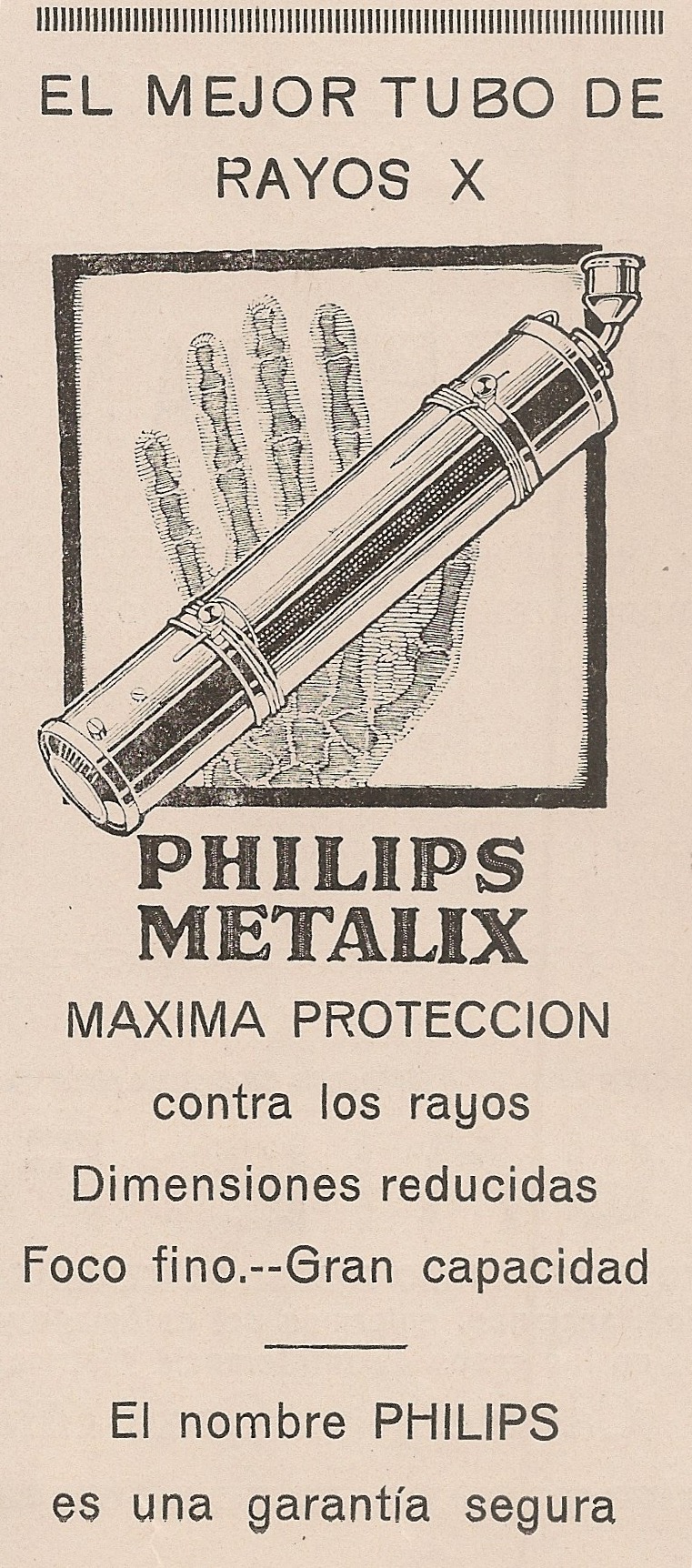 Rayos X. El mejor tubo de rayos X. Philips Metalix. Publicidad aparecida en Gaceta Médica Española. Año 1, número 12, 1927