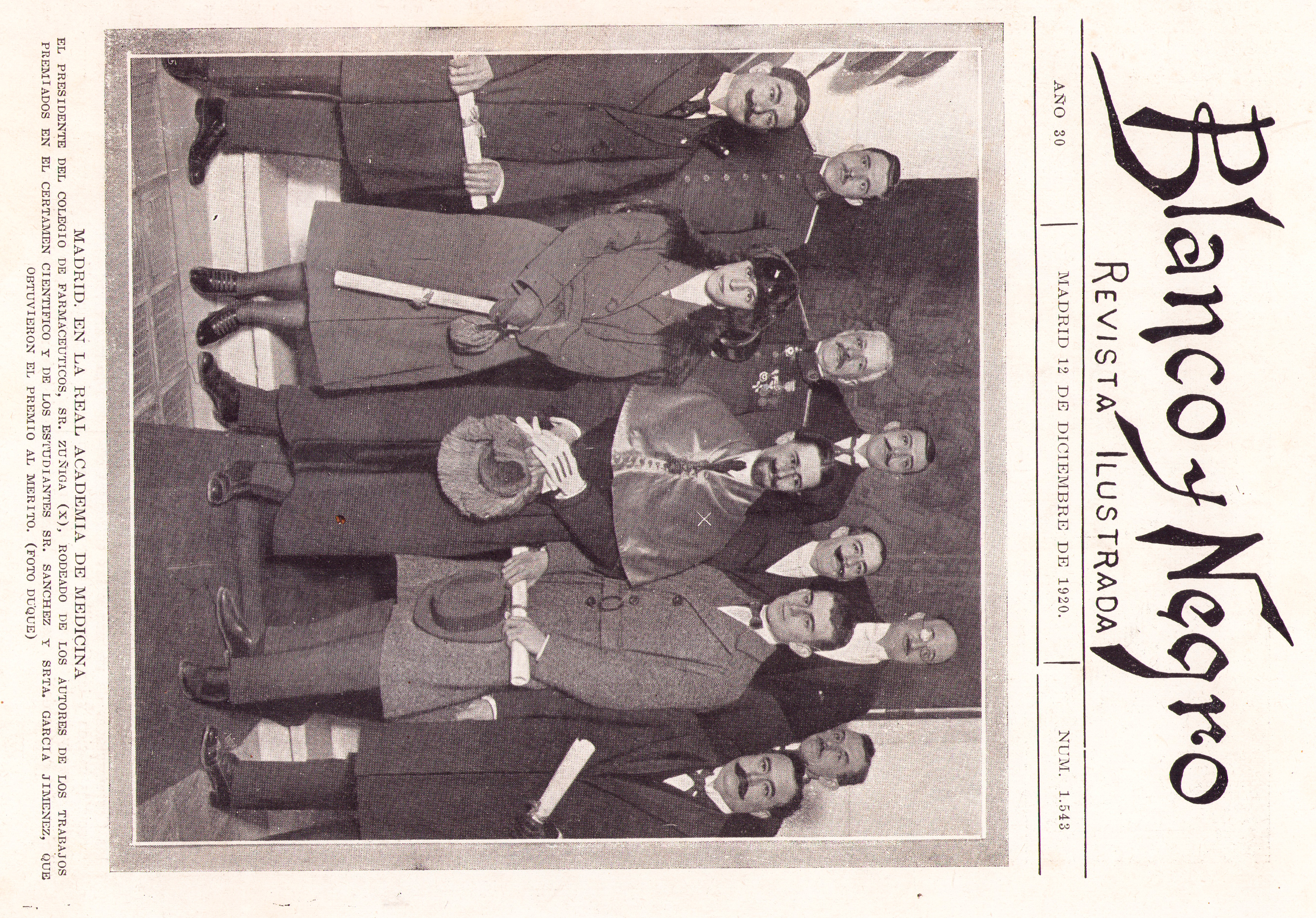Madrid. En la real academia de medicina el presidente del colegio de farmaceuticos, Sr. Zuniga (x), rodeado de los autores de los trabajos premiados en el certamen cientifico y de los estudiantes Sr. Sanchez y Srta. Garcia Jimenez, que obtuvieron el premio al merito.