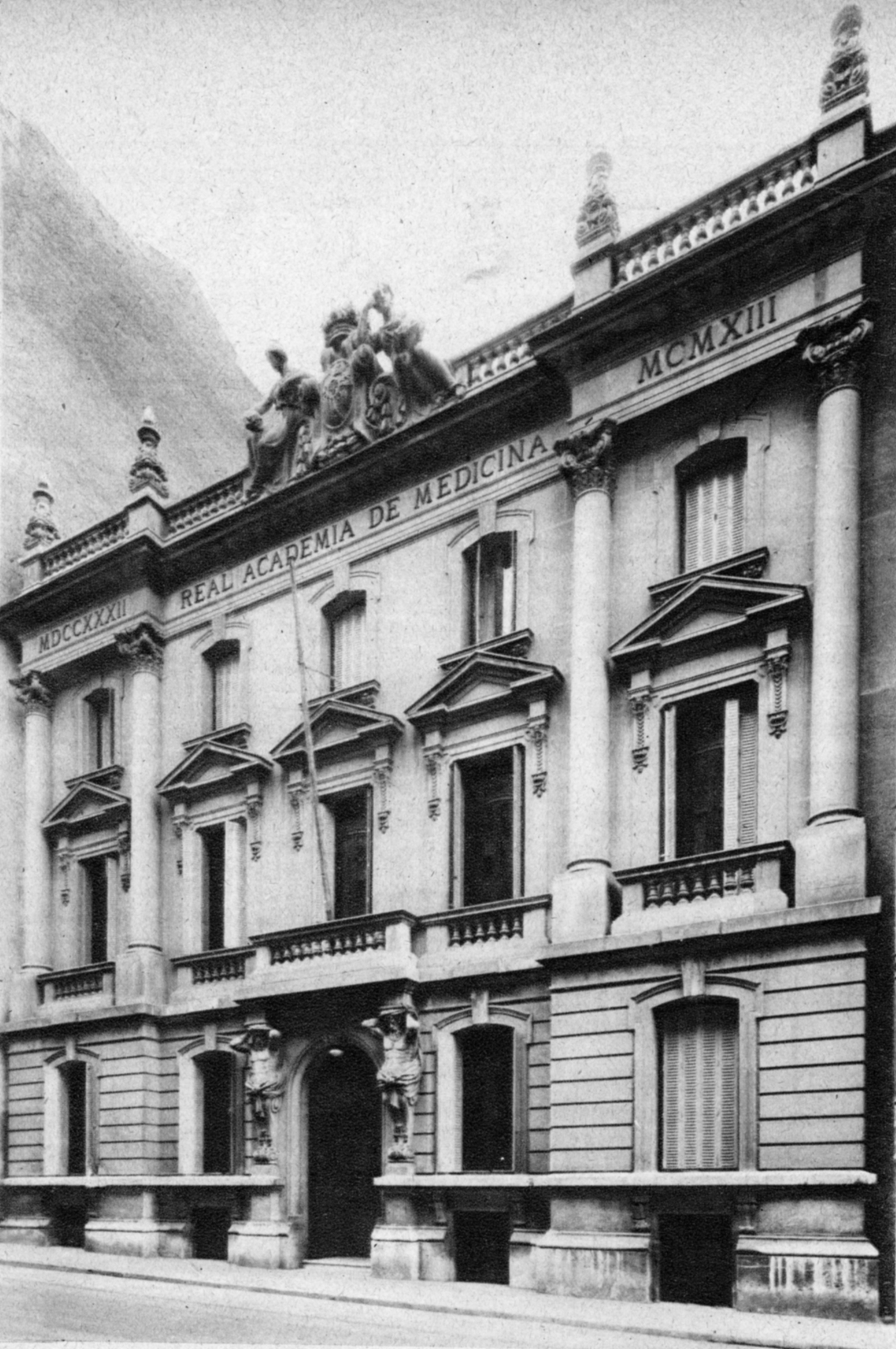 Fachada de la Real Academia de Medicina, a la calle de Arrieta. Consejo General Colegios Médicos España, jun. 1950, p. 35