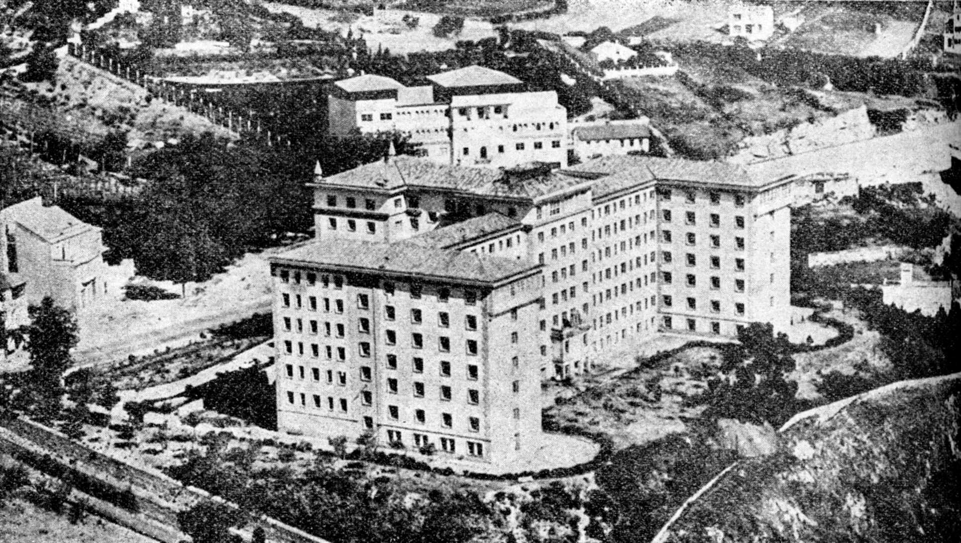Fachada posterolateral y campiña circundante de la Residencia Sanitaria de Juan Canalejo (La Coruña), del S.O.E. .Consejo General de Colegios Médicos de España, 148, Marzo 1961