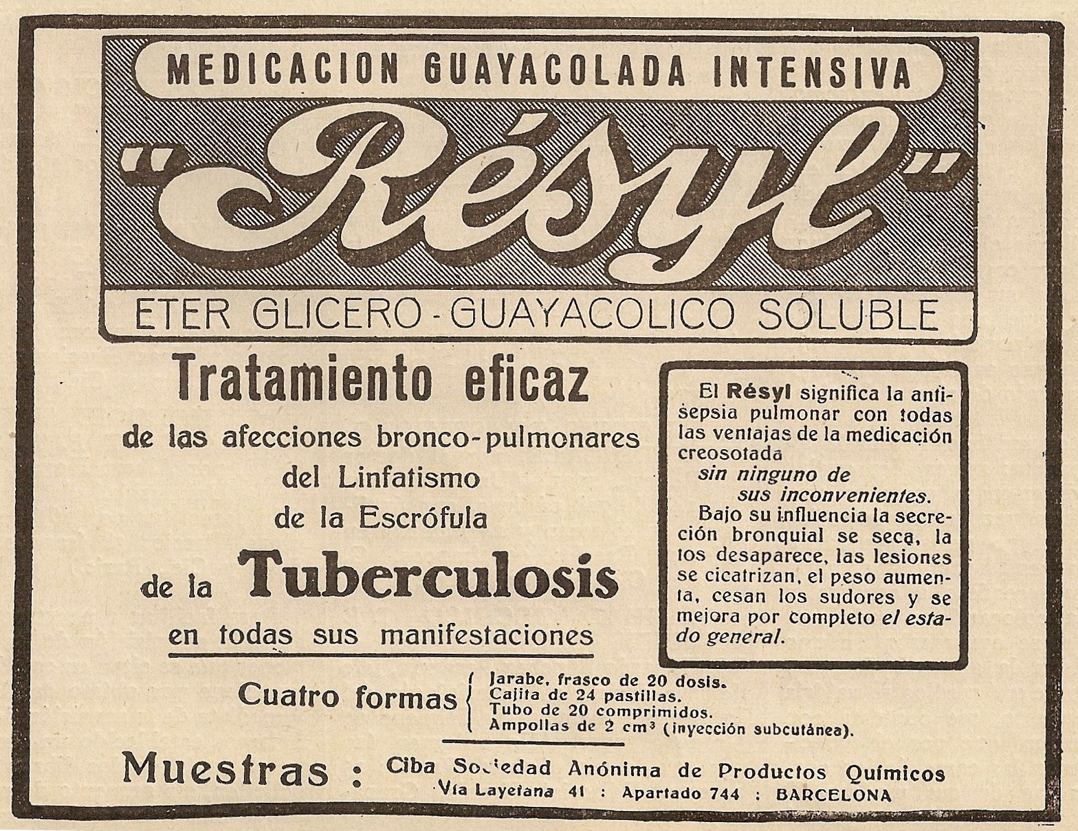 Resyl. Tratamiento eficaz de la tuberculosis. Ciba, Bareclona. La Medicina Ibera, 24 de Enero de 1931.