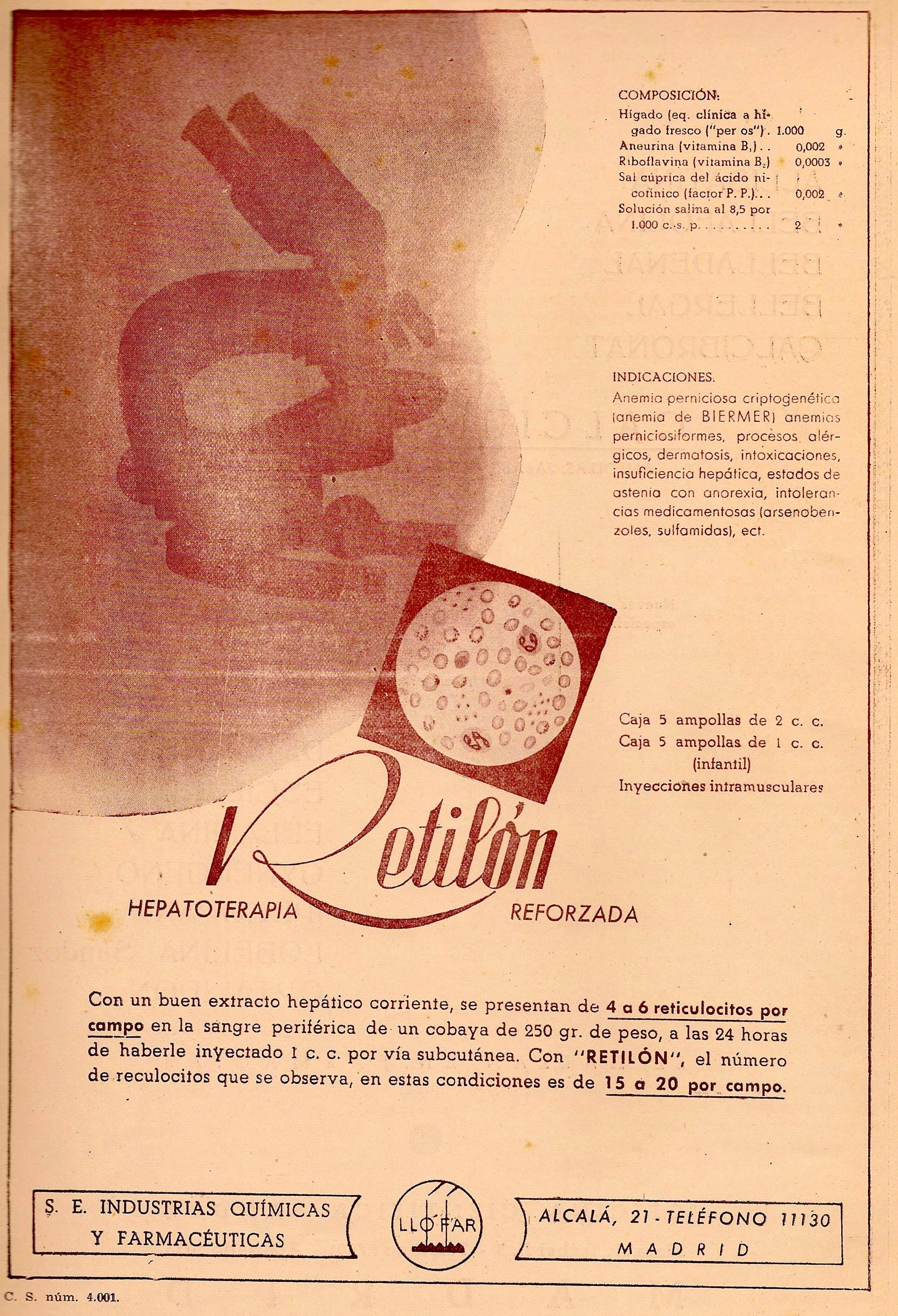 Retilón. Hepatoterapia. Ampollas. Hígado, vitamina B, ácido nicotínico. riboflavina. Aneurina. Ampollas. Intramuscular. Industrias Químicas y Farmacéuticas. Llorar. Madrid. Publicidad aparecida en la revista Gaceta Médica Española. Año 18, número 1, 1944.
