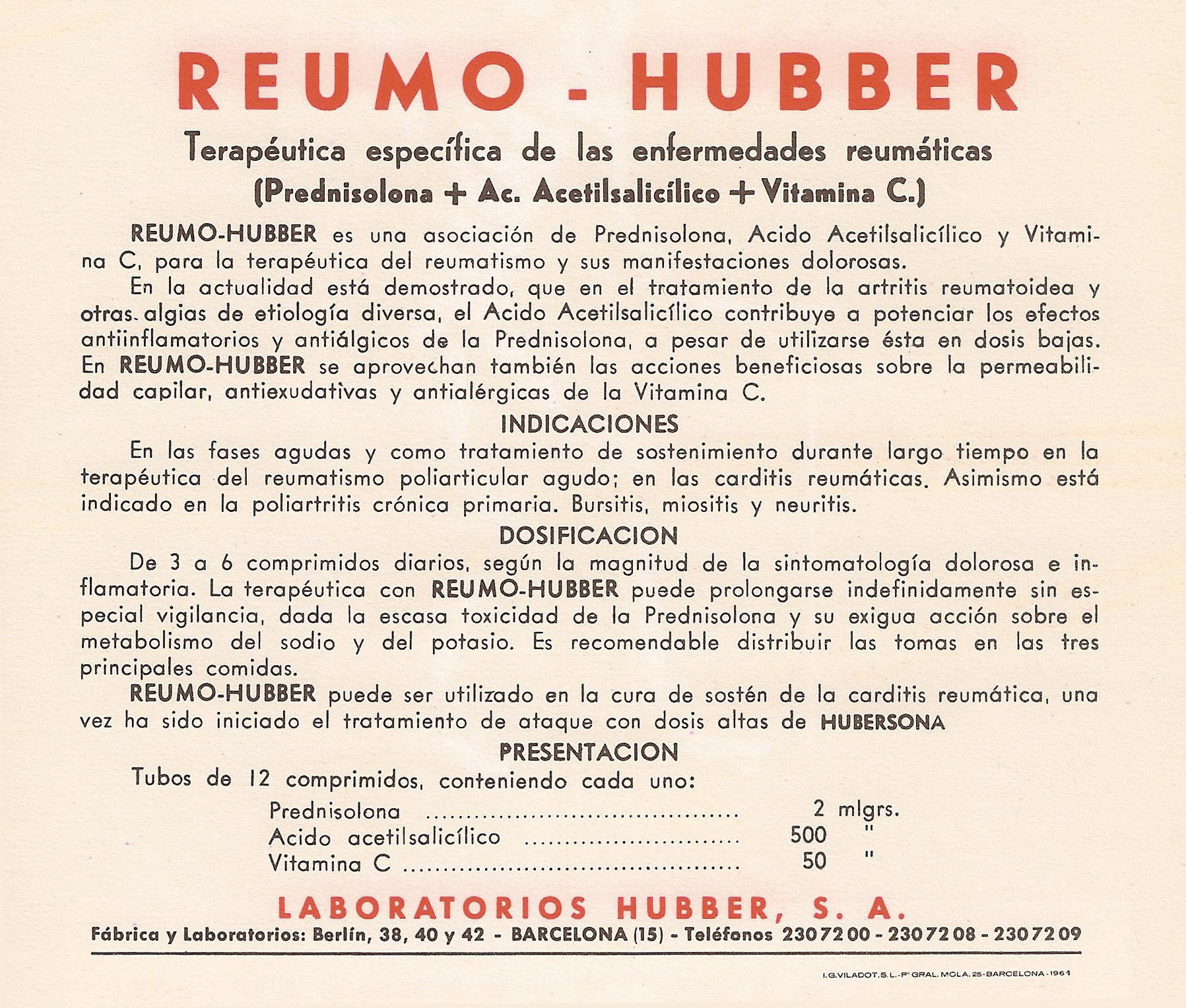 Reumo-Hubber. Encarte en Archivos de la Facultad de Medicina de Madrid, 1964.