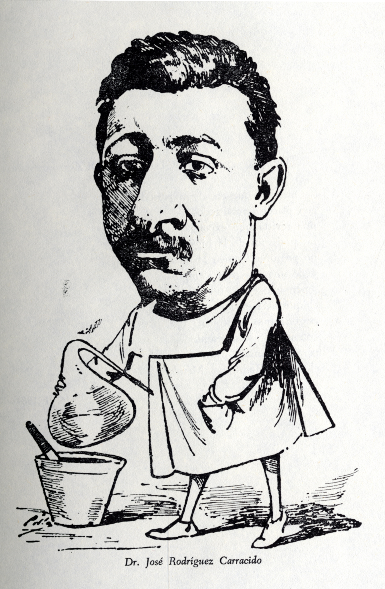 Caricatura del Dr. D. José Rodríguez Carracido (1856 – 1928) , por Cilla, sacada del libro del Prof. D. Luís Sánchez Granjel, ‘Biografía de “El Dr. Sangredo” (1883-1884)’, que fue una revista médica del siglo XIX que se subtitulaba “Revista satírica quincenal. Dedicada a los hijos de Esculapio”. Pag. 123.