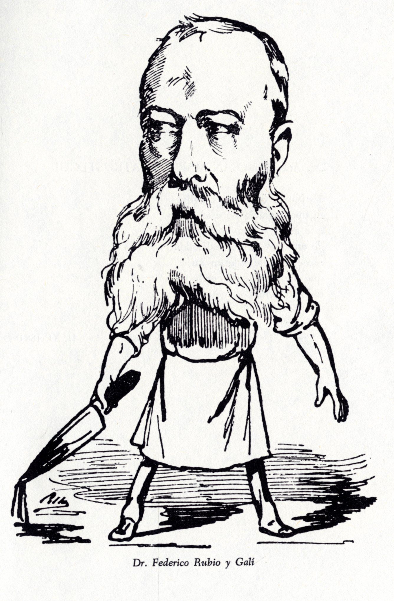 Caricatura del Dr. D. Federico Rubio y Galí (1827 – 1902), por Cilla, sacada del libro del Prof. D. Luís Sánchez Granjel, ‘Biografía de “El Dr. Sangredo” (1883-1884)’, que fue una revista médica del siglo XIX que se subtitulaba “Revista satírica quincenal. Dedicada a los hijos de Esculapio”. Pag. 127.